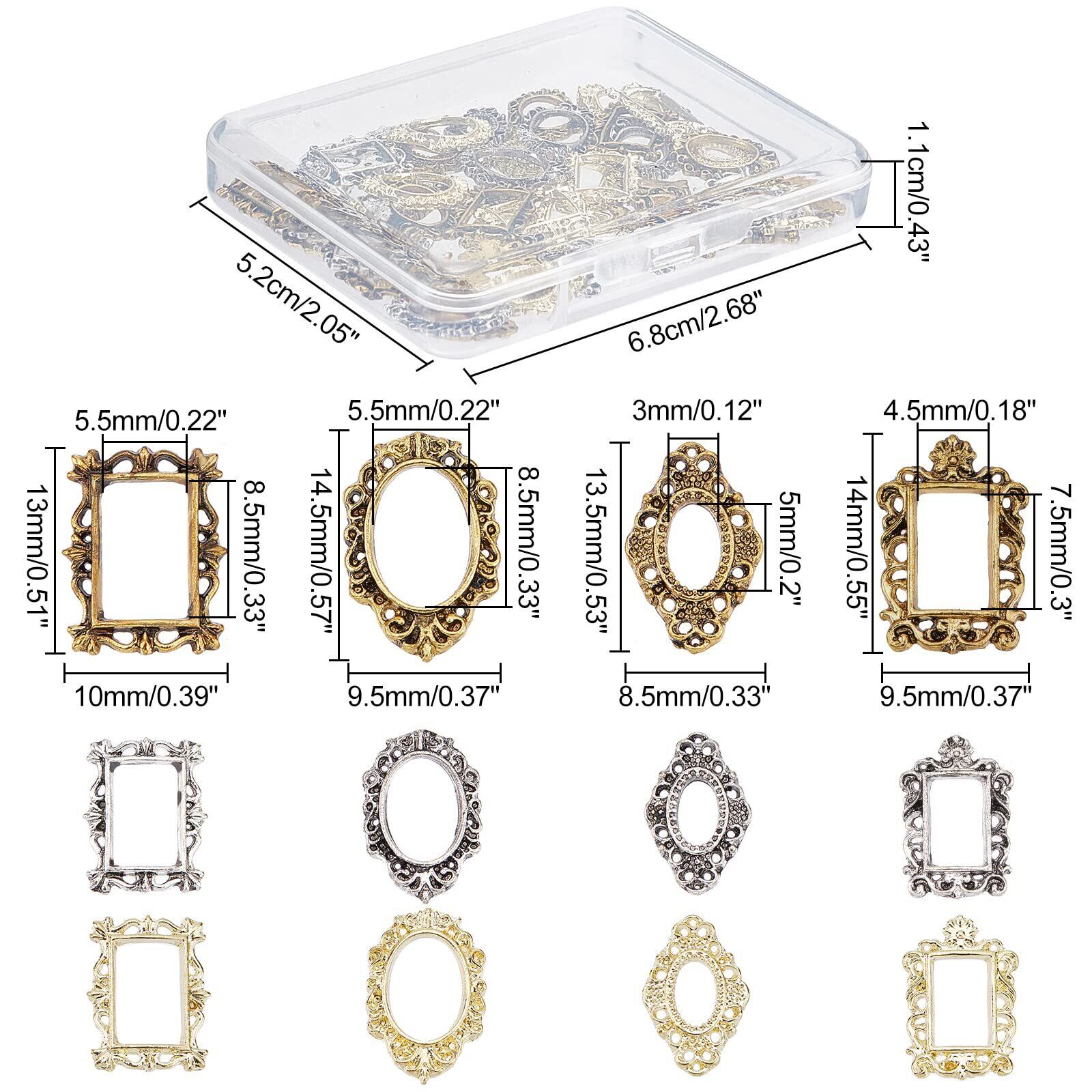 【サイズ詳細】写真フレームのメタルパーツ:菱形:約13.5x8.5x1.5mm;楕円形:約14.5x9.5x1.5mm;長方形:約14x9.5x1mm/約13x10x1mm;各形5点/セット、3色、1セット/色、3セット、合計60点があります。