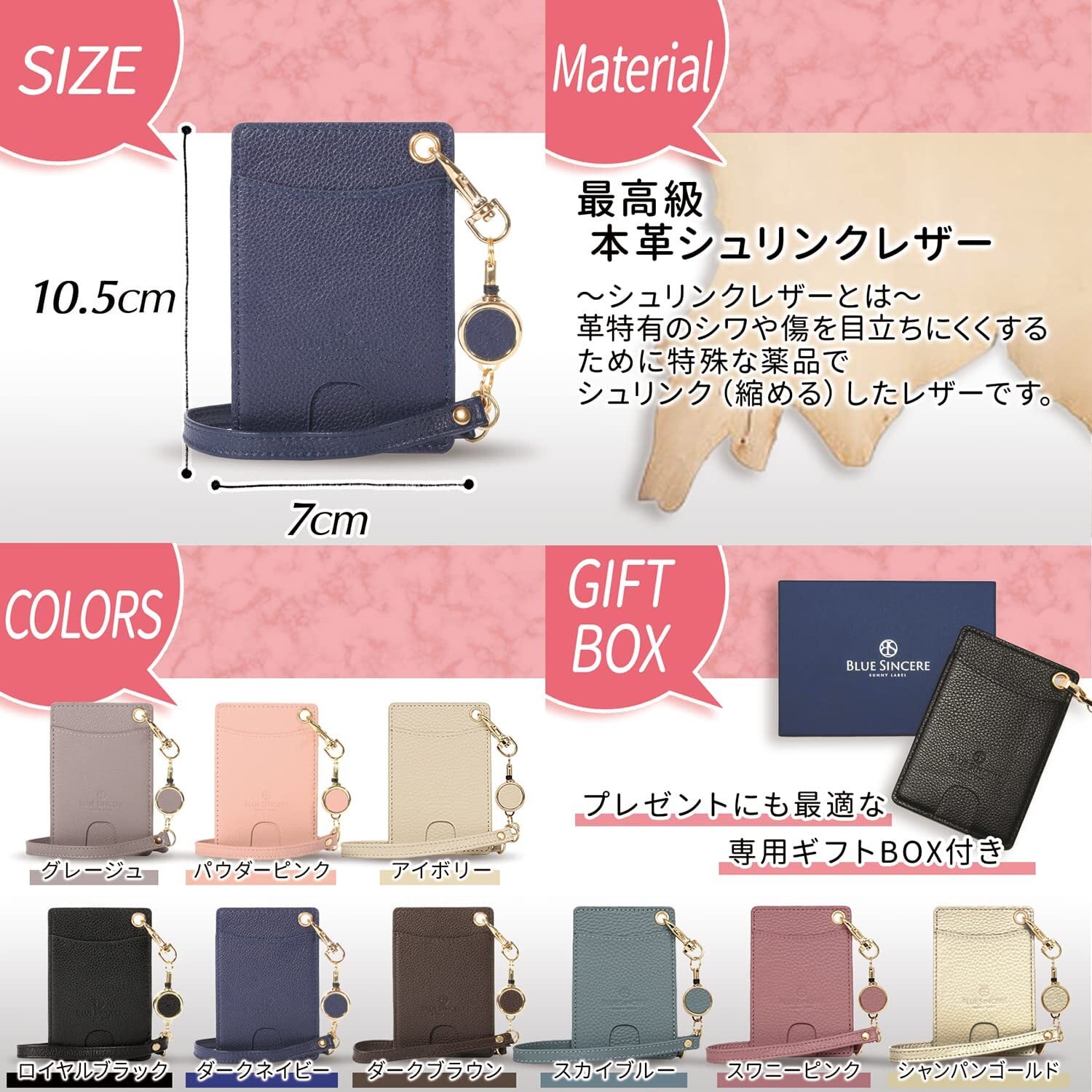 [BLUE SINCERE] ブルーシンシア パスケース リール付き 本革 定期入れ レディース シュリンクレザー 2枚 両面 伸びる ストラップ付き icカードケース / PC3 | hananoki