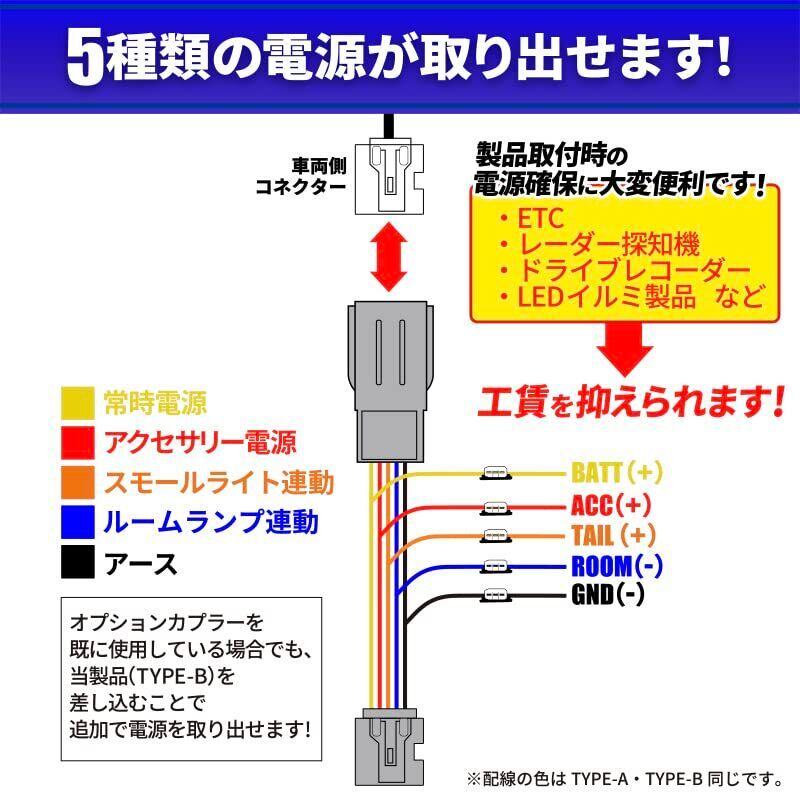 常時電源、ACC、アース(マイナス)、ルームランプ連動(マイナス)、スモールライト連動の5種類の電源取りがこれひとつで取り出せます!