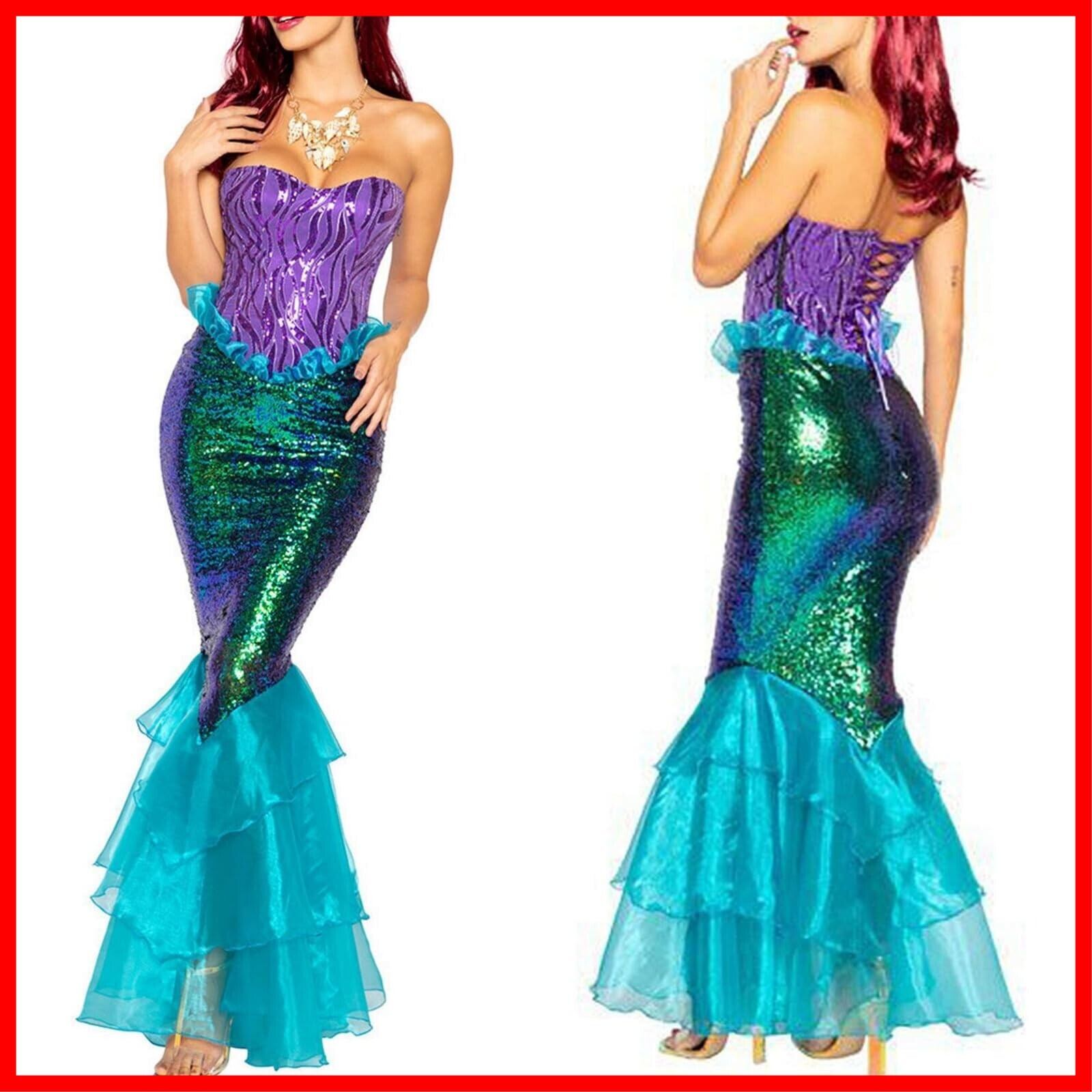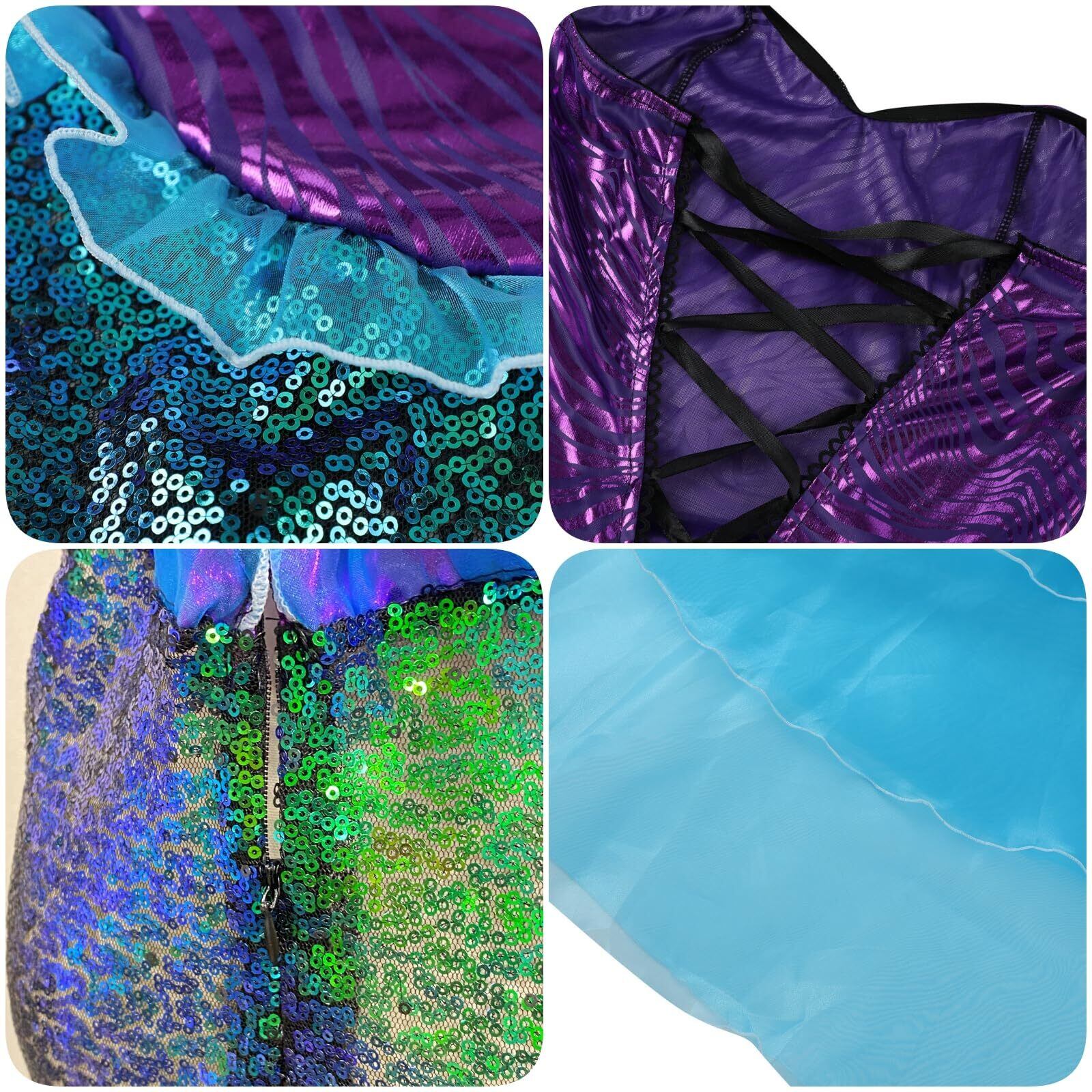 バスト部分はゴム入りでしっかりフィット。バットファスナー付きで着脱もしやすく、背中には紐で細かいサイズ調整も可能です。パープルのバストの模様部分、中央のグリーン部分、そして水色の尾ひれの部分はシースルーになっています。必要に応じてアンダースカートなど着用することをおすすめします。サイズはSからXXLまで選べます。ハロウィンの仮装パーティーにもぴったり。※モデル画像はイメージになります。実際の商品はマネキン着用のものになります。背中の紐部分はモデル画像は紫色ですが、実際の商品はマネキン画像の黒色のものになります。予めご了承ください。