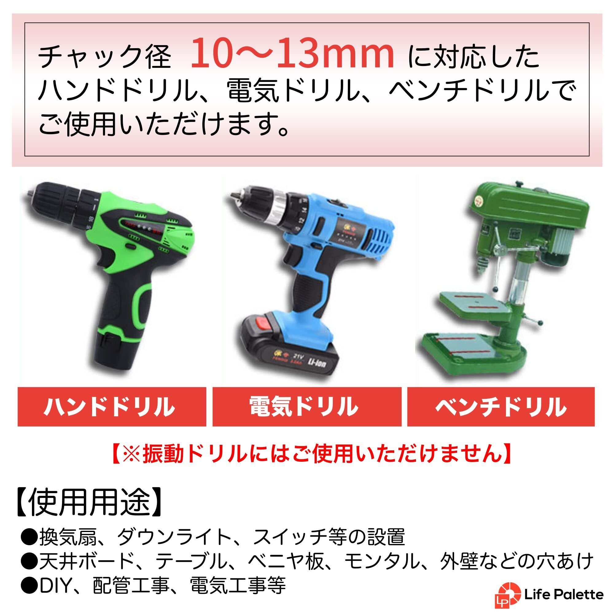 適用材質:アルミ板(3mm以下)、鉄板(3mm以下)、木材、プラスチック、石膏ボード等 【使用上の注意】 部材に対し垂直に使用してください。途中からドリルを傾けたりしないで下さい。 作業時はゴーグルやマスク等の保護具を装着してください。 作業時はホールソー本体が熱を持っており、火傷の恐れがありますので素手で触らないようにしてください。