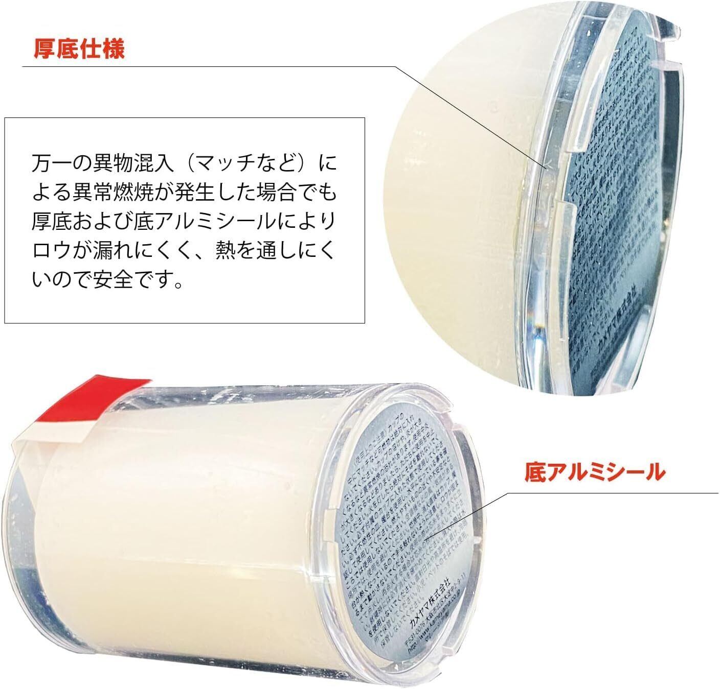 万一の異物混入(マッチなど)による異常燃焼が発生した場合でも、厚底および底アルミシールにより、ロウが漏れにくく、熱を通しにくいので、安全です。