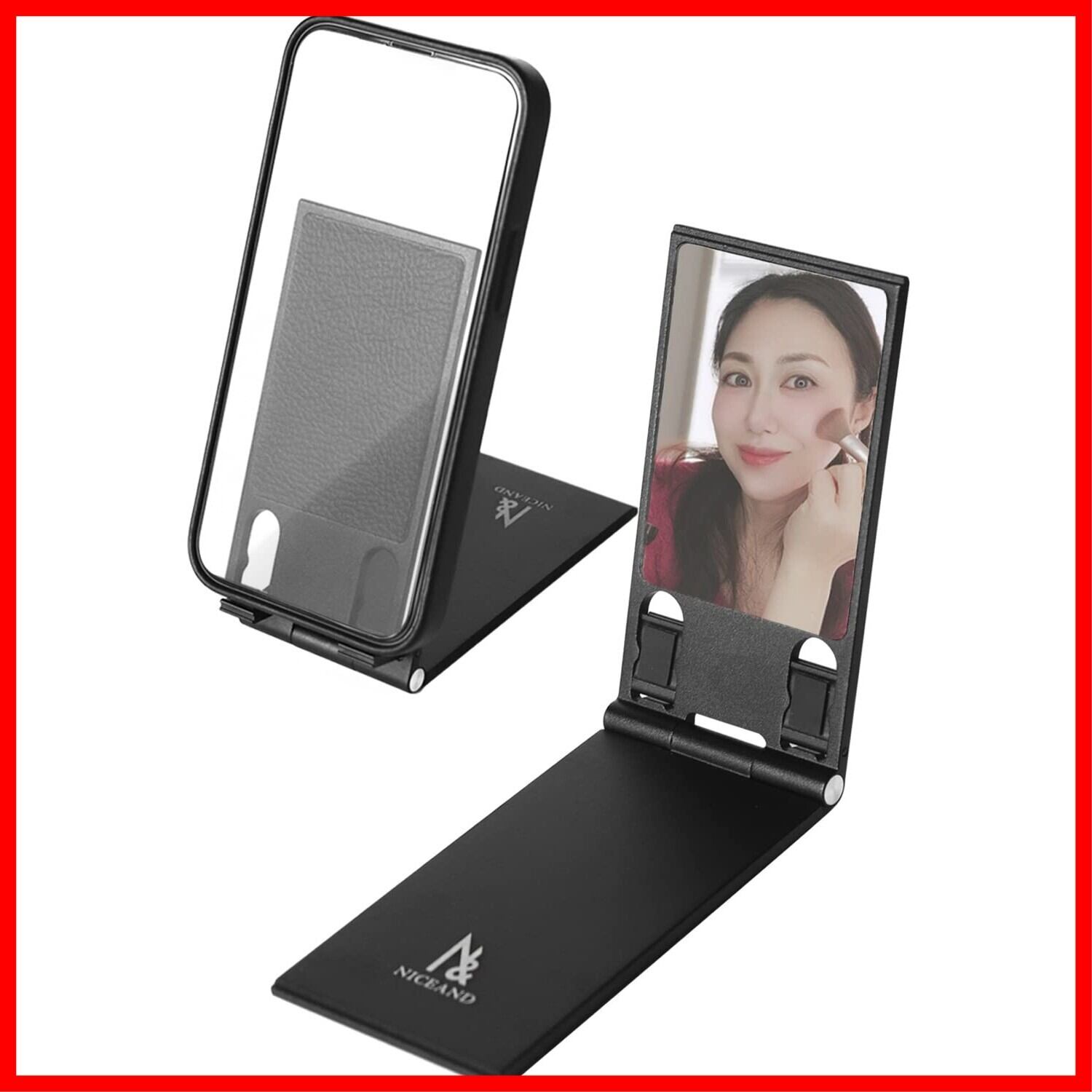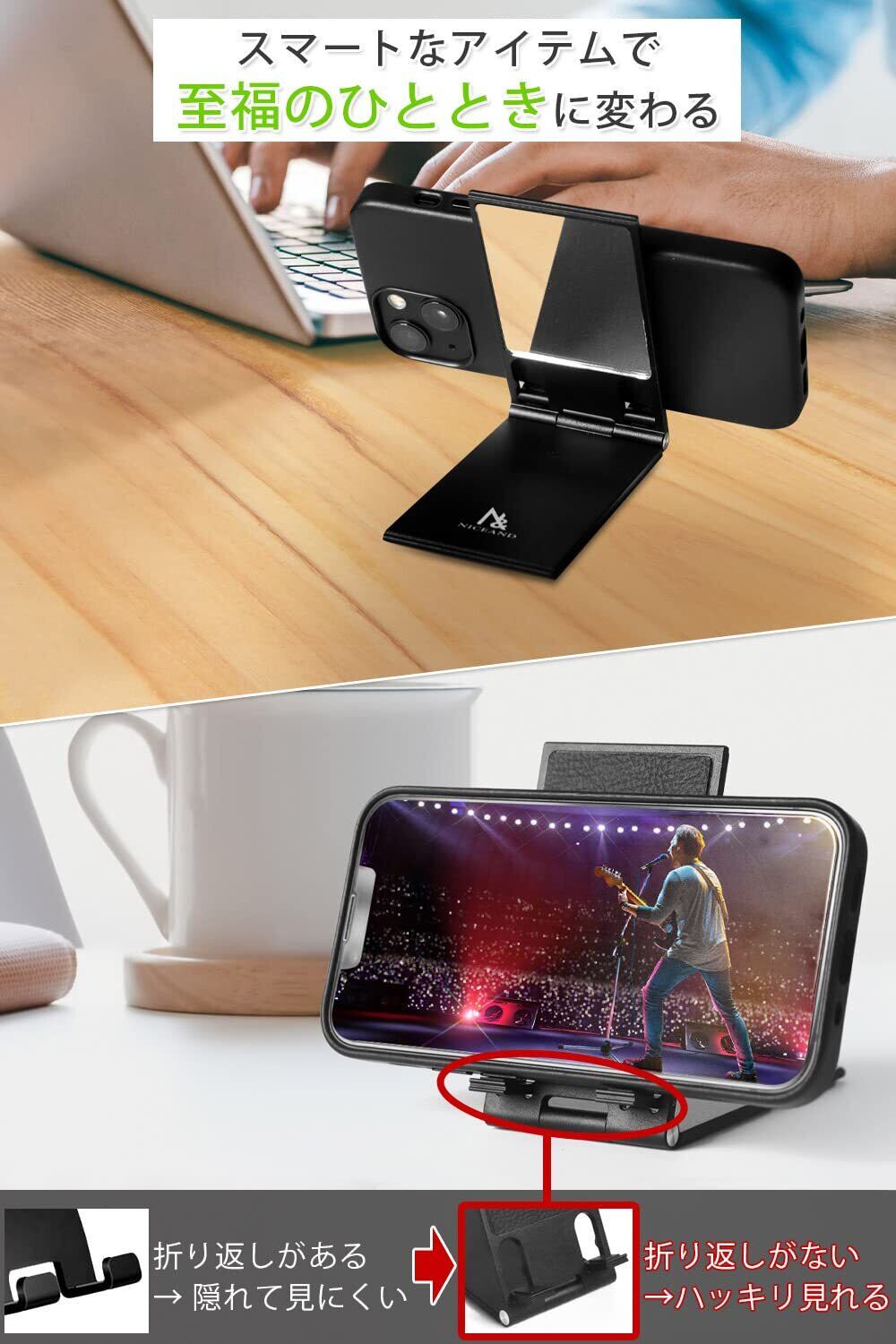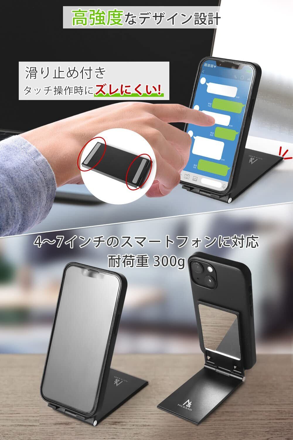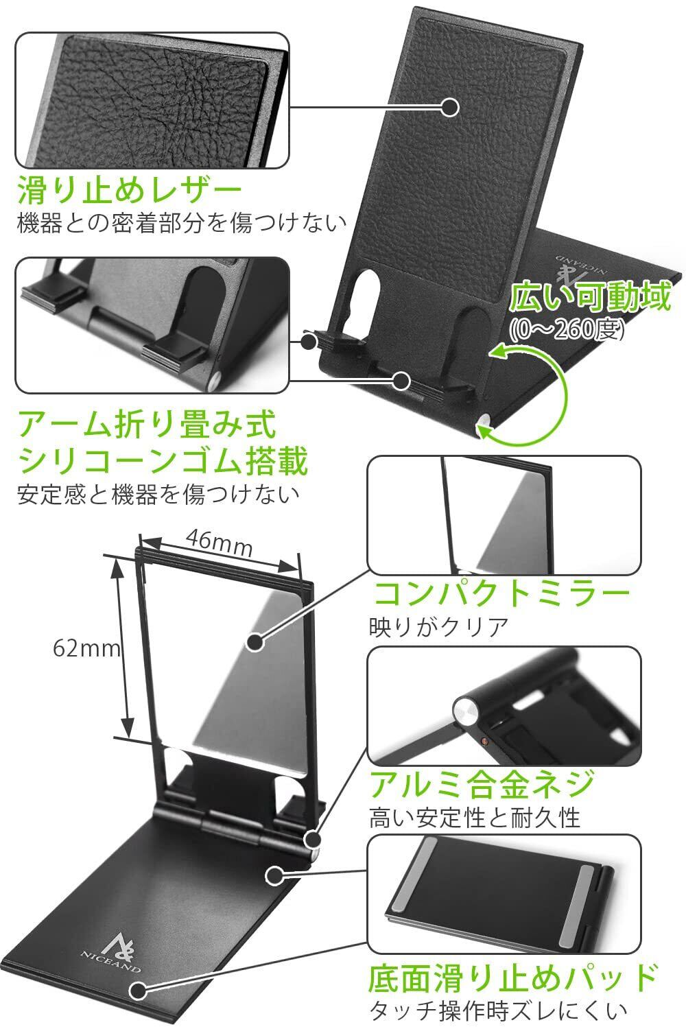 NICEAND アルミ製スマホスタンド 折りたたみ式 軽量 ミラー付き 卓上用 ブラック NA-001