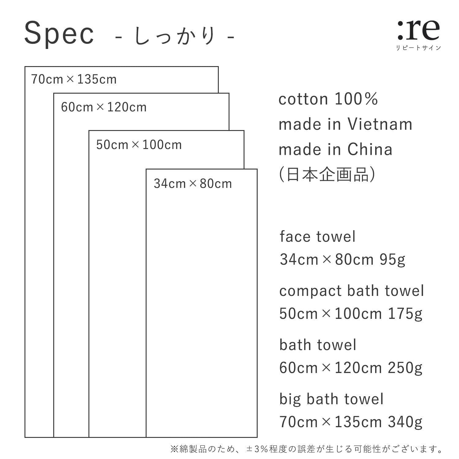 【商品サイズ・重さ】フェイス:34×80cm(約95g)、コンパクトバス(ミニバス):50×100cm(約175g)、バス:60×120cm(約250g)、大判バス:70×135cm(約340g)【カラー】ベージュ(薄黄土色),カフェオレ(黄土色),グレー(灰色),ミストブルー(青),ニューブラウン(茶色),ネイビー(紺色),ロゼ(桃色),ティーグリーン(緑),ホワイト(白),ストライプベージュ,ストライプブルー,ストライプグレー,ストライプロゼ,Rストライプベージュ,Rストライプブルー,Rストライプグリーン,Rストライプレッド(■製造ロットにより色味が若干異なる場合がございますが品質には問題ございません。)【素材】綿100%【生産地】中国・ベトナム(ロットにより異なります)