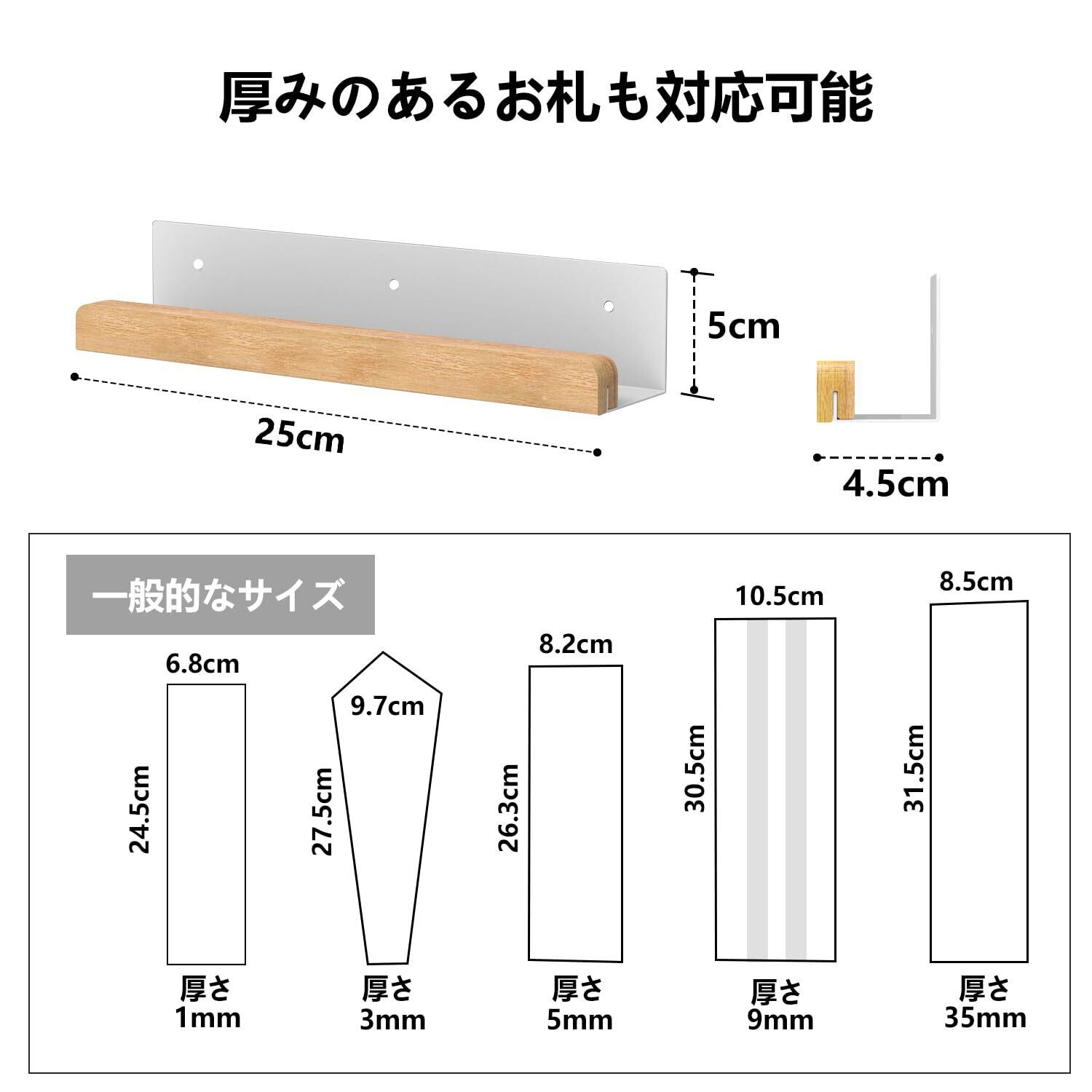 【簡単設置で、すぐに使える】壁に木ネジまたは 石こうボード用プッシュピンで固定するだけ。木ネジで取り付け可能は壁:柱・かもい・板壁・プリント合板。石こうボード用プッシュピンで取り付け可能な壁:壁紙・布壁紙・ビニール壁紙貼りなどの石こうボード。寸法:長さ25×幅4.5×高さ5cm、内寸24.5×3.5cm。付属品は3本の石こうボード用プッシュピンと3本の木ネジです(神棚写真にイメージでお祀りの御札や御朱印帳などの付属はありません。)