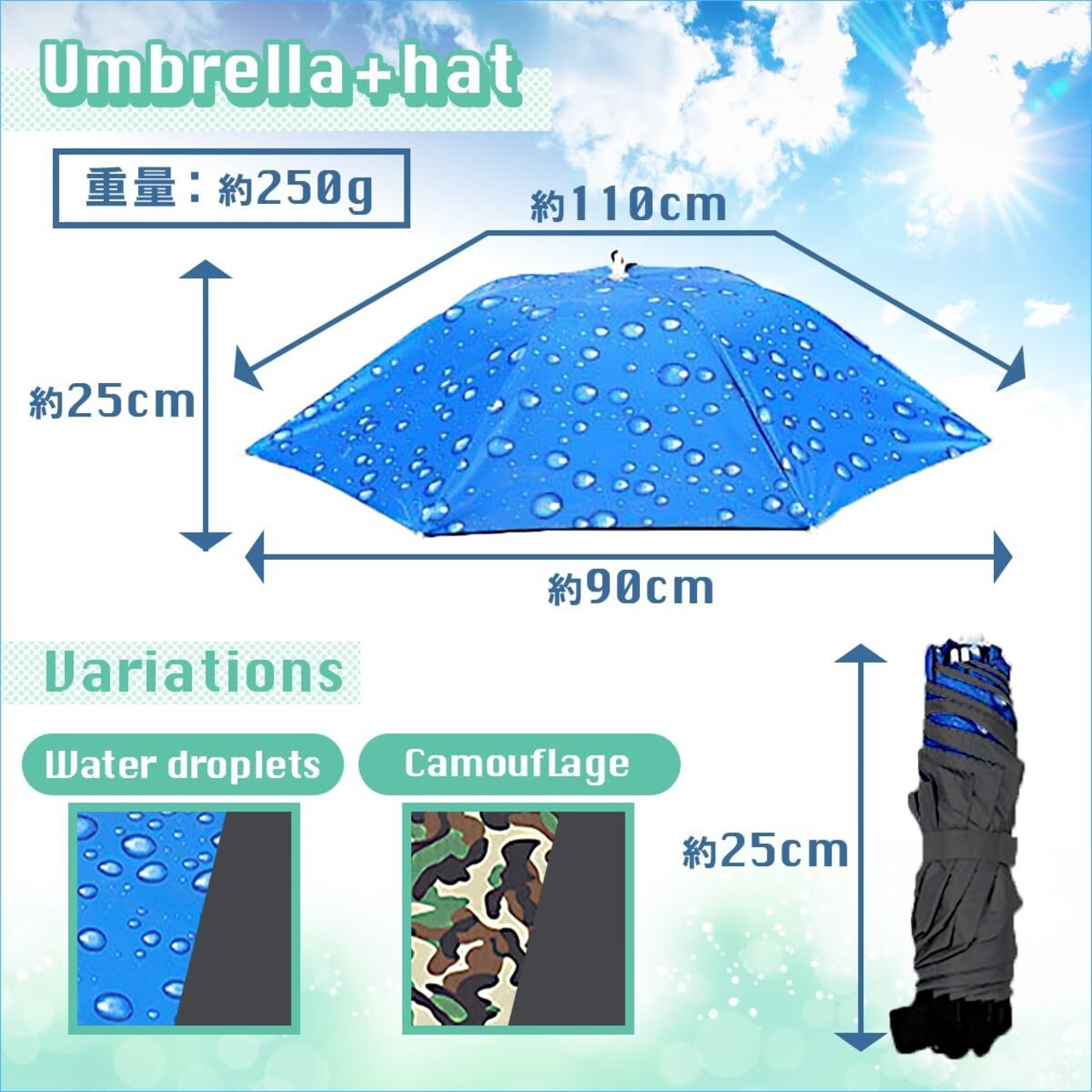 多用途で大活躍 この傘帽子は両手が使えるため、釣りやスポーツ観戦、ガーデニング、農作業、ハイキング、ビーチ、犬の散歩やカメラ撮影、DIY作業など多様なアクティビティにも対応。ユニークで面白いデザインが目を引き、友達や家族との楽しい時間を演出します。 【商品仕様】重量:250g【サイズ】収納時:約25㎝、開閉時:直径約90㎝x高さ約25㎝【カラー展開】WaterDroplets/CamoufLage