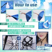 装着も簡単に あごの下でしっかりと固定できるため、風が強い日でも安心です。使用シーンに合わせて簡単に装着可能です。使用の際は、白いキャップを抑えて上部の紐を引き上げて開き、ヘッドバンドをかぶり、アジャスターで固定して装着が完了するので、たったの3ステップで簡単に利用できます。これにより、どんなアクティビティでも快適に過ごせます。