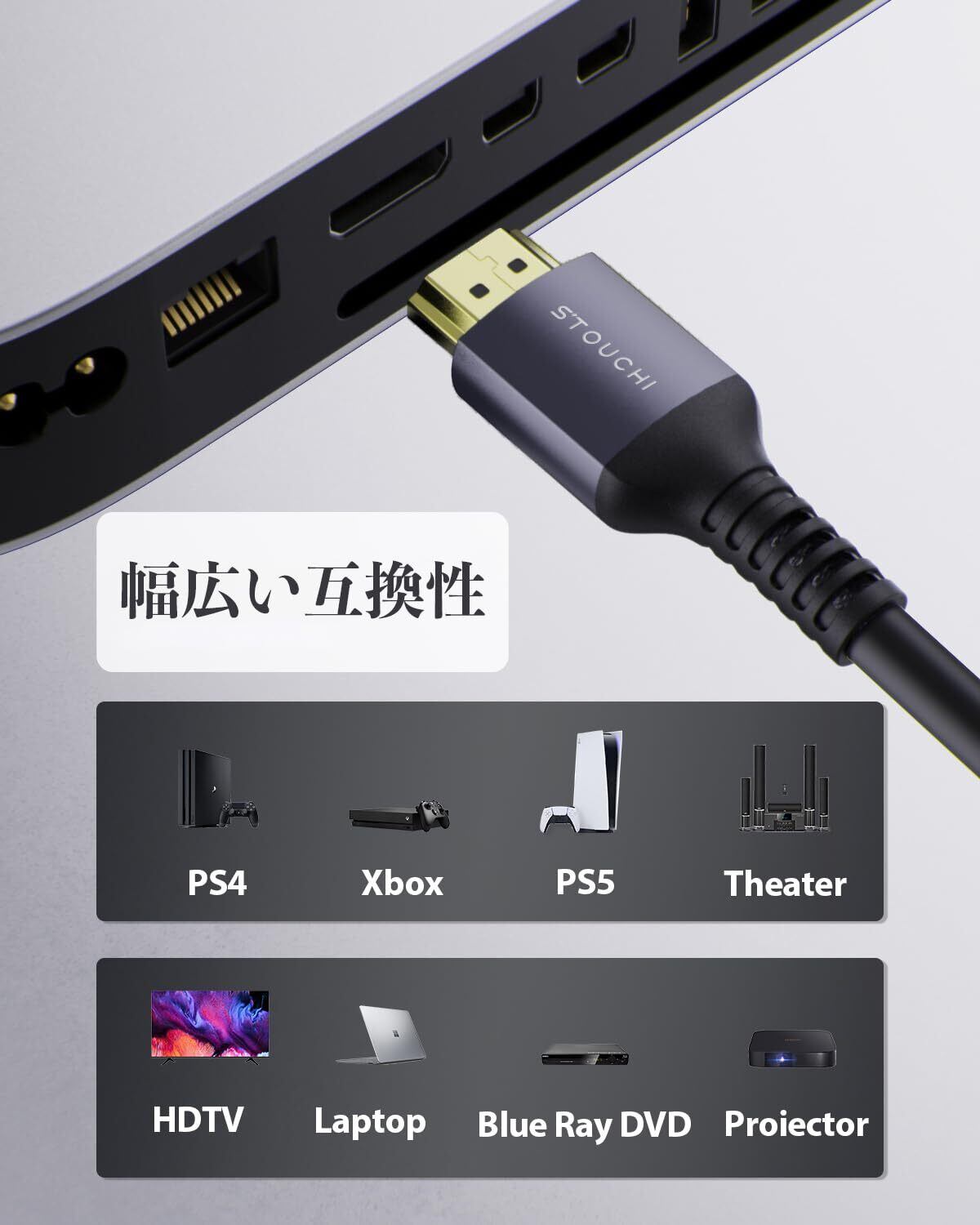 【製品仕様】:最大伝送速度:48Gbps、HDCP: 2.2&2.3、Dynamic HDR:対応、CEC:対応、eARC(エンハンスド・オーディオリターンチャンネル):対応、EHAC(HDMIイーサネットチャンネル):対応、ケーブル方向性:なし、最大解像度:8K@60Hz。Stouchiは、ウルトラハイスピードHDMI認証ケーブルを用途に合わせて各種の長さを取り揃えておりますので、ご安心してお買い求めください。