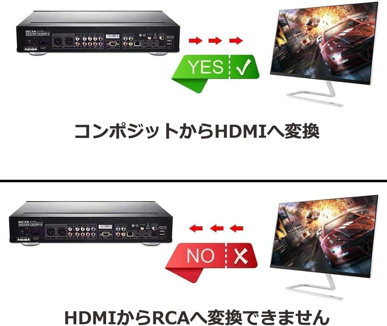 【RCA to HDMI 変換コンバーター 】 ●RCAコンポジット(赤、白、黄)入力をHDMI 720P/1080P(60HZ)出力に変換し、HDTV/モニターに表示します。 ●ドライバーは必要なくて、プラグアンドプレイするだけです。 ●【単一RCA信号から単一HDMI通信に変換のみ】【HDMI信号をコンポジット信号にする逆の使い方はできません。】【アナログ映像をPCに取り込めることには対応できません。】