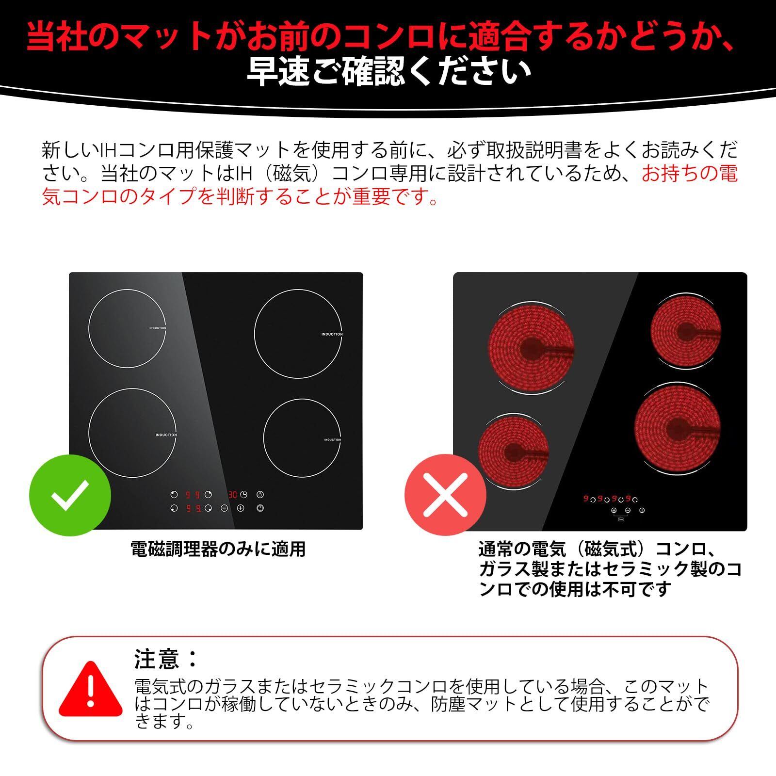 【傷防止、IH使用の方におすすめ】IHコンロのガラス天板は、大切に使っていても長年使うとどうしても傷で摩耗してきて、見た目が悪くなる。このマットを使えばこうした傷を防ぐことができる。見た目はおしゃれだし、熱伝導率に問題もなく、ガラストップを傷付ける心配もないので安心です。シートをひいても加熱調理に何ら支障はありません!