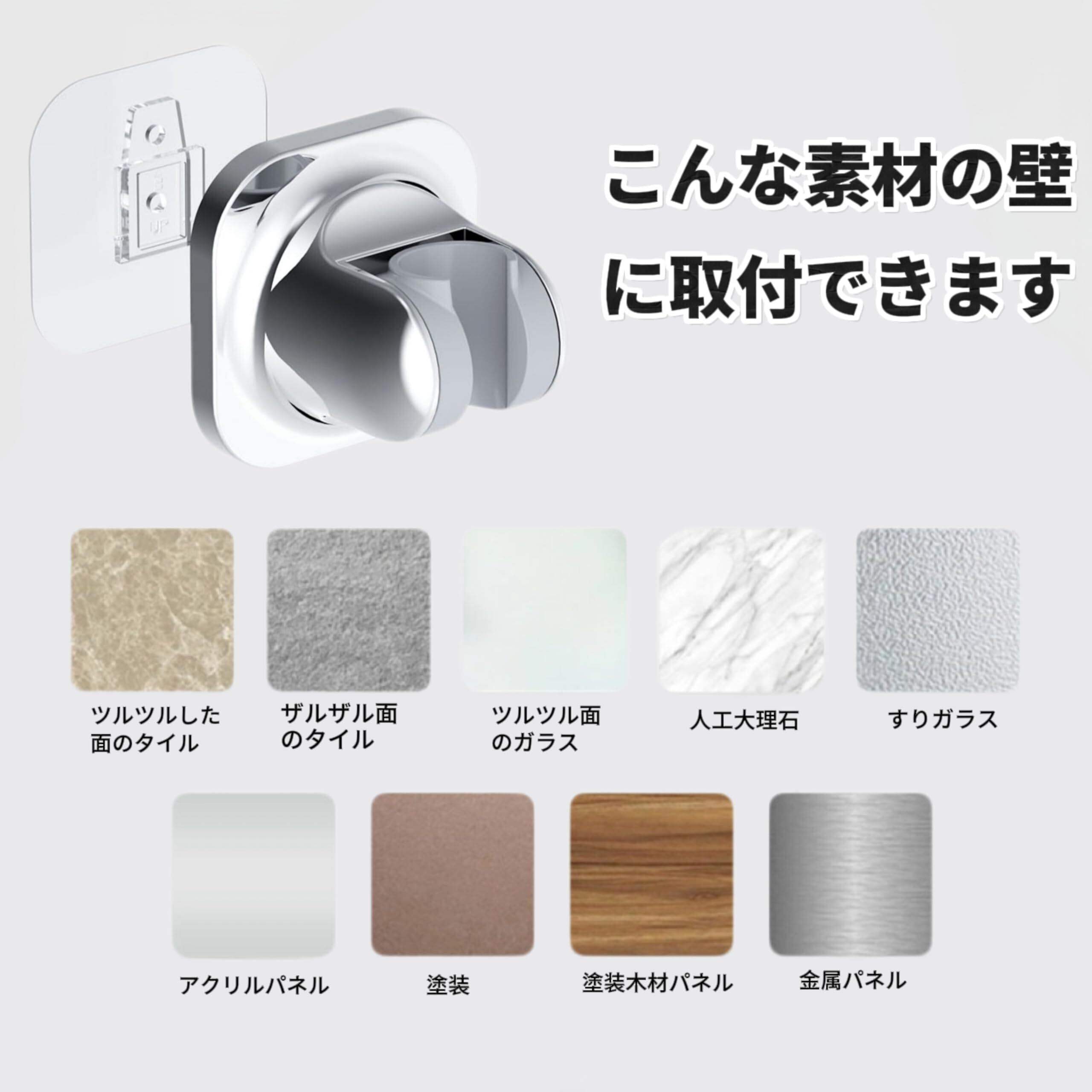 【強い適用性】穴あけ不要シャワーフックは、タイル、ガラス、大理石などの様々な壁材に適しており、角度と高さが調整可能で、異なるニーズに対応します。しかし凹凸のある表面には適していません。