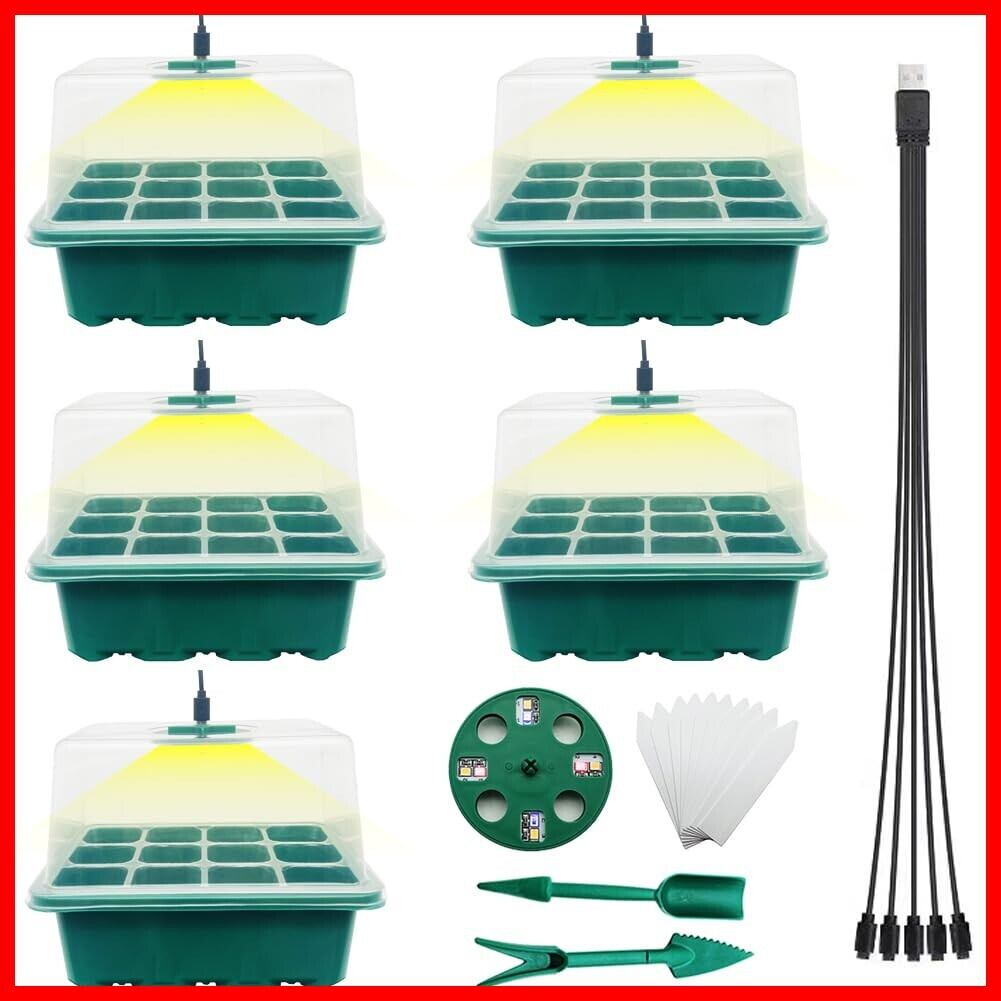 育苗ポット植物育成ライト付き 育苗トレイ 育苗箱 12穴 5個セット 高くする透明カバー 種子トレイ 発芽•育苗セット 種まきハウス 苗箱 種まき器 育苗ボックス 便利性 耐久性 通気性 野菜栽培 多肉植物 家庭菜園 園芸/植栽/庭園 プラグトレイ