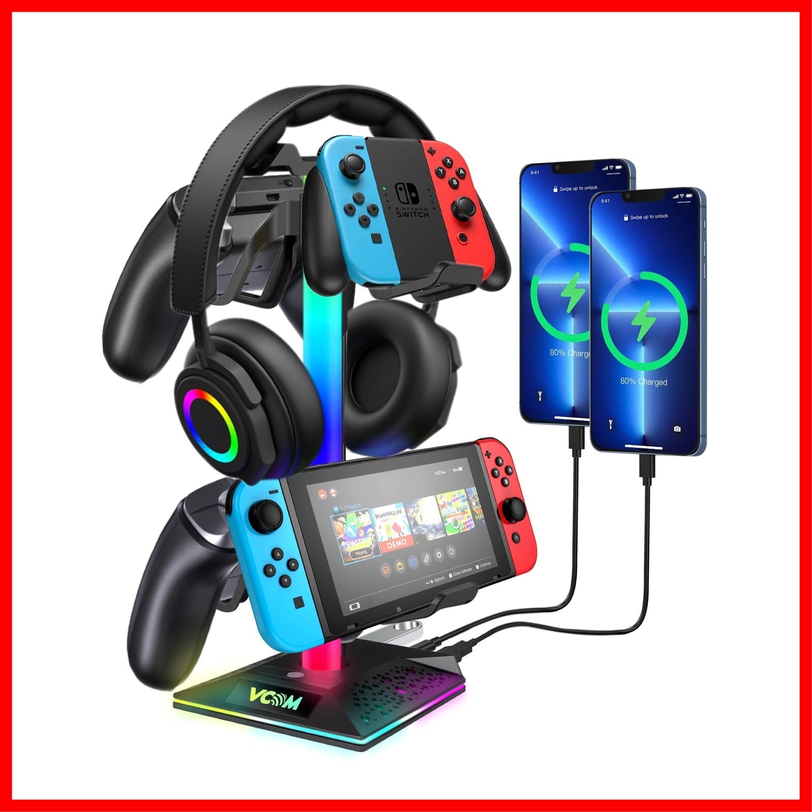 VCOMアップグレード版 ヘッドホンスタンド 多機能7色充電式 USB Aポート*2&USB Cポート*1搭載 [ゲームパッド &ゲームコントローラー&ヘッドセット ]ホルダー 収納対策 省スペース ヘッドホン/コントローラー/スイッチ/iPad/携帯電話/デスク用 組立簡単 ヘッドホンハンガ (ブラック)