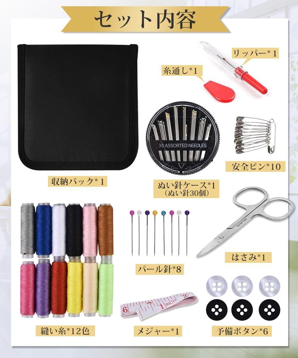 セット内容:収納バック*1、縫い糸*12色、ぬい針ケース*1(ぬい針30個)、糸通し*1、安全ピン*10、はさみ*1、リッパー*1、メジャー*1、パール針*8、予備ボタン*6。