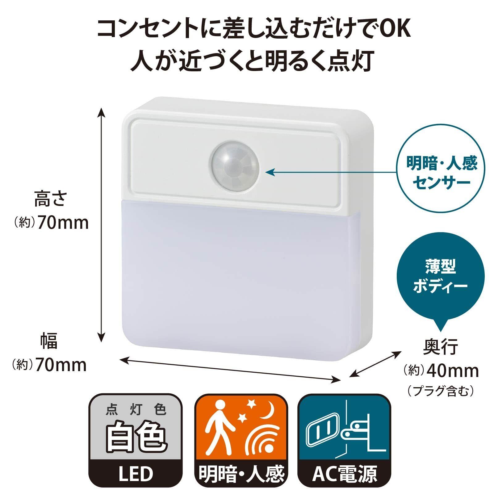 【 特 長 】 ● コンセントに差し込むだけの簡単設置 ● LEDを上向きにすれば周囲を明るく、下向きにすればフットライトに ● 明るさ約45ルーメン ● 周囲が暗くなり人が近づくと約10秒間点灯します ● 耐トラッキングプラグ ● LEDを使用しているので長寿命、省電力です ● 薄型ボディー ● 点灯色は昼白色LED 【 仕 様 】 ■ 電源:AC100V 50/60Hz ■ 消費電力:約0.51W ■ 使用光源:LED3灯(交換不可)/昼白色 ■ 全光束:約45 lm ■ 点灯保持時間:約10秒 ■ 人感センサー検知範囲:約4m/左右約90°/上下約90° ■ 本体寸法:(約)幅70×高70×奥行40mm(プラグ含む) ■ 質量:約57g