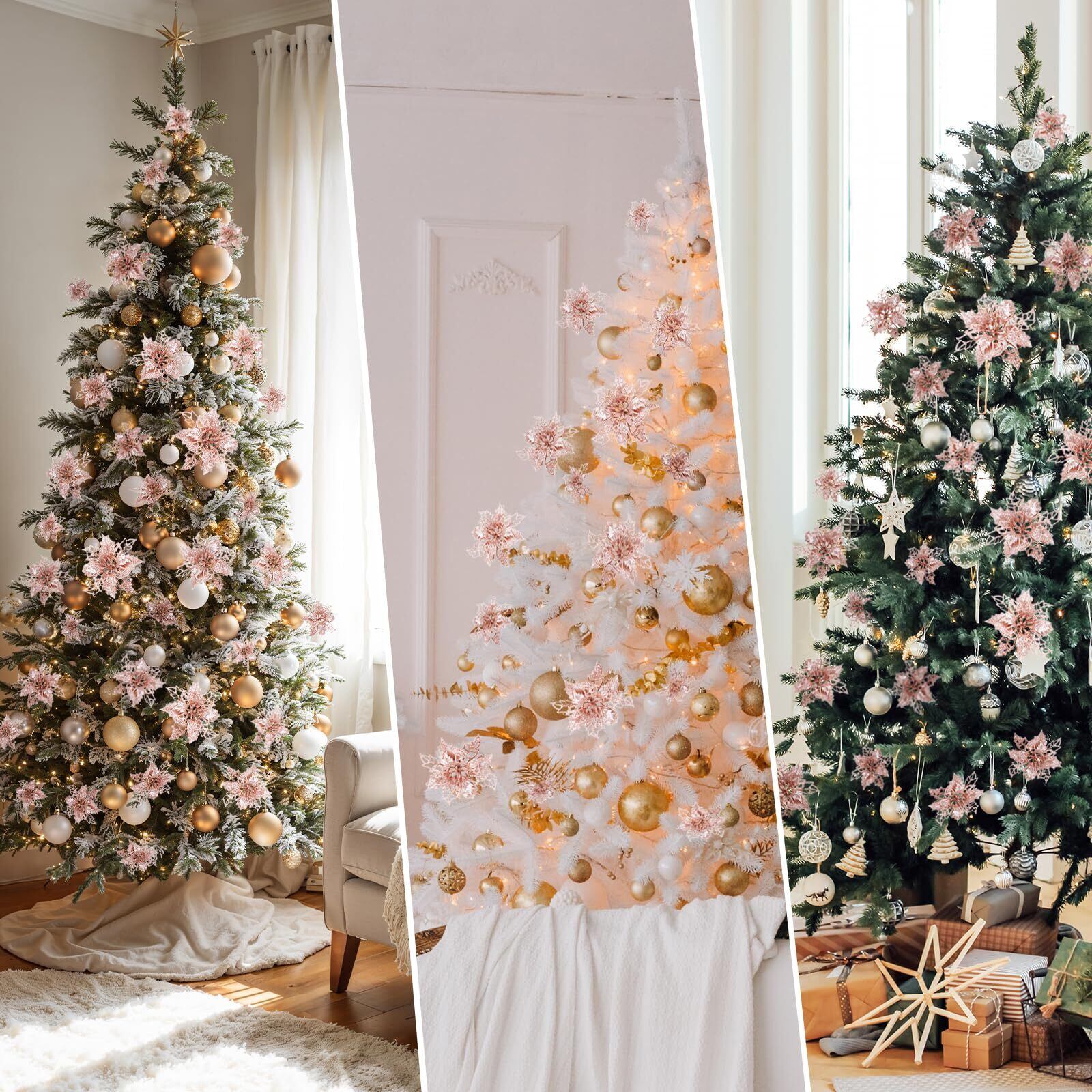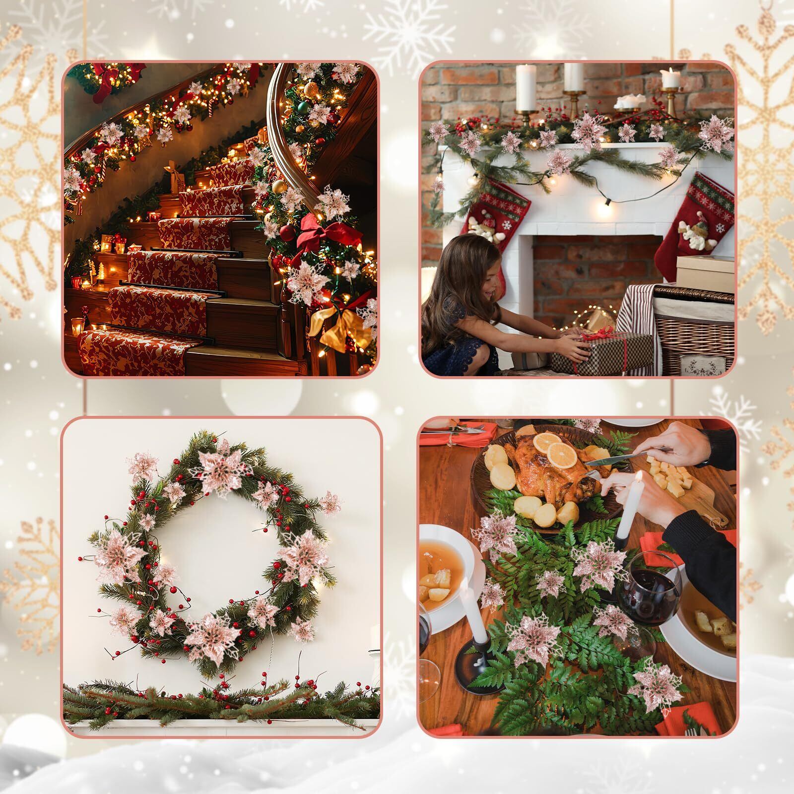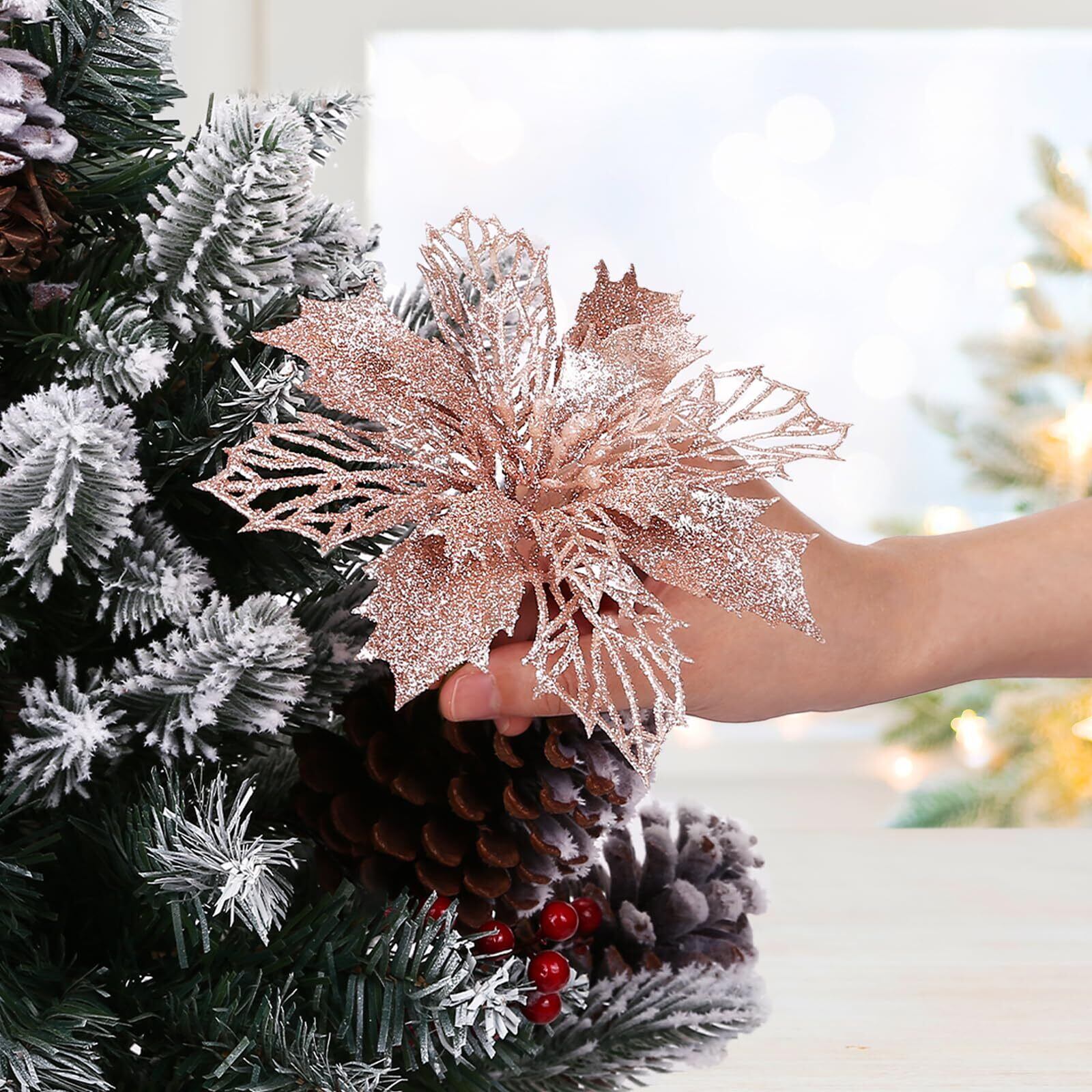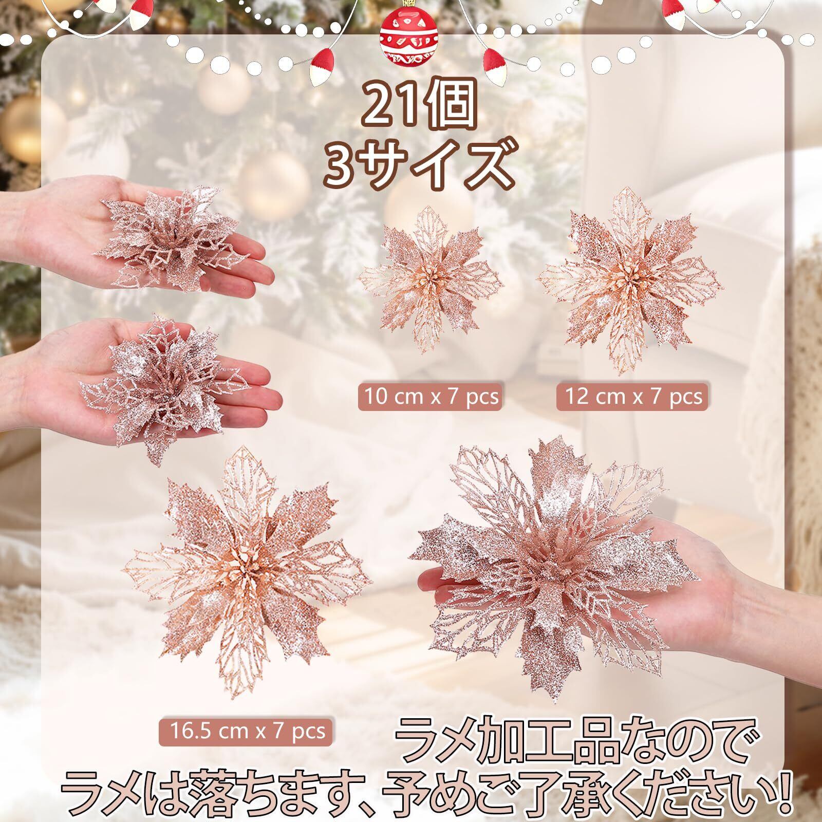 クリスマスの雰囲気を高めるこのローズゴールドの装飾的な花は、お部屋を上品で華やかに演出します。21個のセットには、大きさの異なる3種類の花が含まれています。最大サイズは直径約16.5cm、中サイズは約12cm、最小サイズは約10cmです。きらびやかなグリッターが施された繊細なデザインは、クリスマスツリーや壁掛け、テーブルセンターピースなど様々な用途で活躍します。華やかさとエレガンスを兼ね備えた、この特別な装飾品で、今年のホリデーシーズンを彩りましょう。