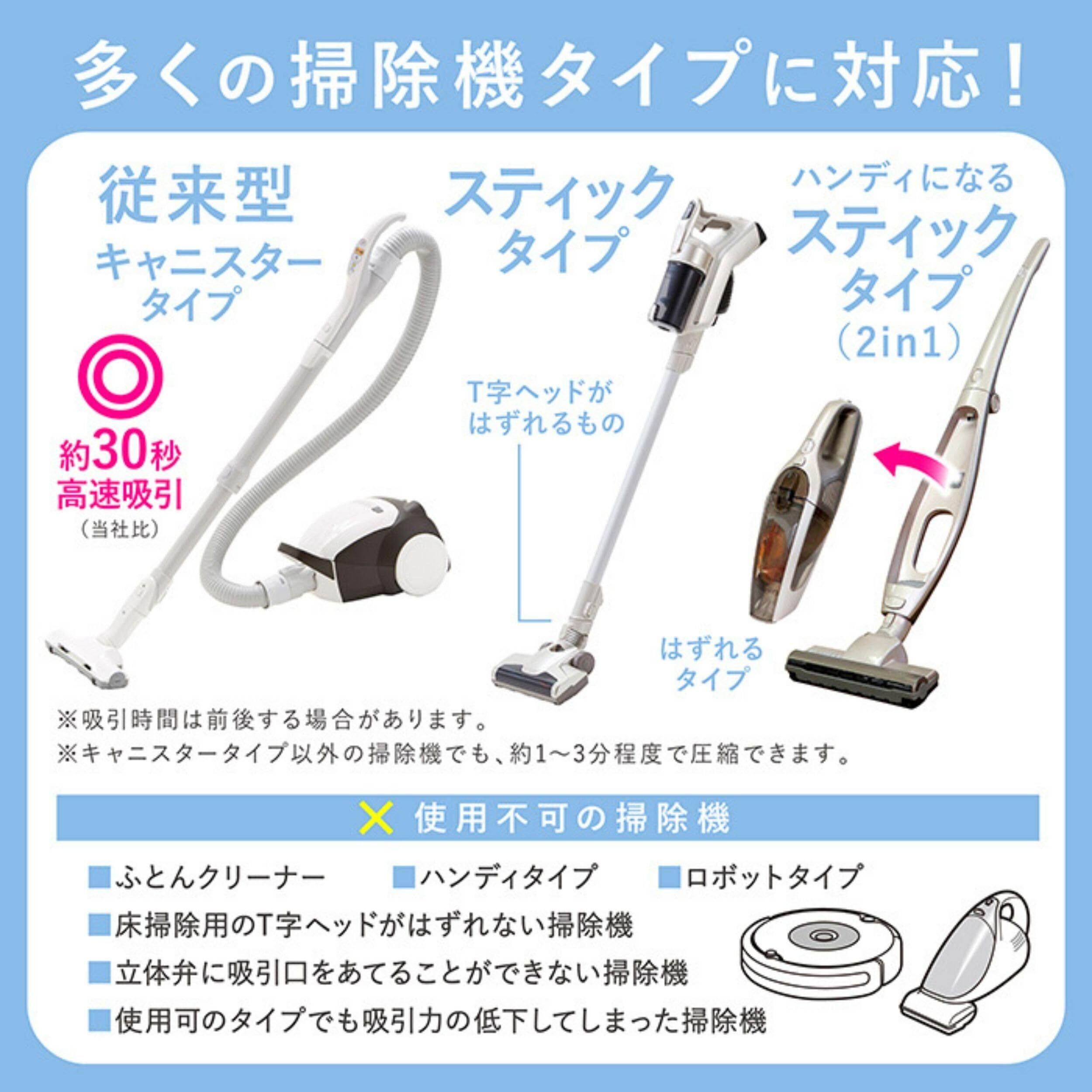 ●従来型(キャニスタータイプ)、スティック掃除機に対応した圧縮袋です。※一部、吸引時間がかかったり使えない掃除機もあります。