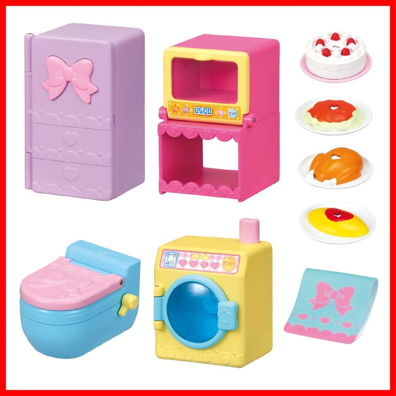 セット内容:れいぞうこ、レンジ、トイレ、せんたくき、タオル、たべものパーツ(ケーキ、パスタ、チキン、オムライス) ※お人形は含まれません。