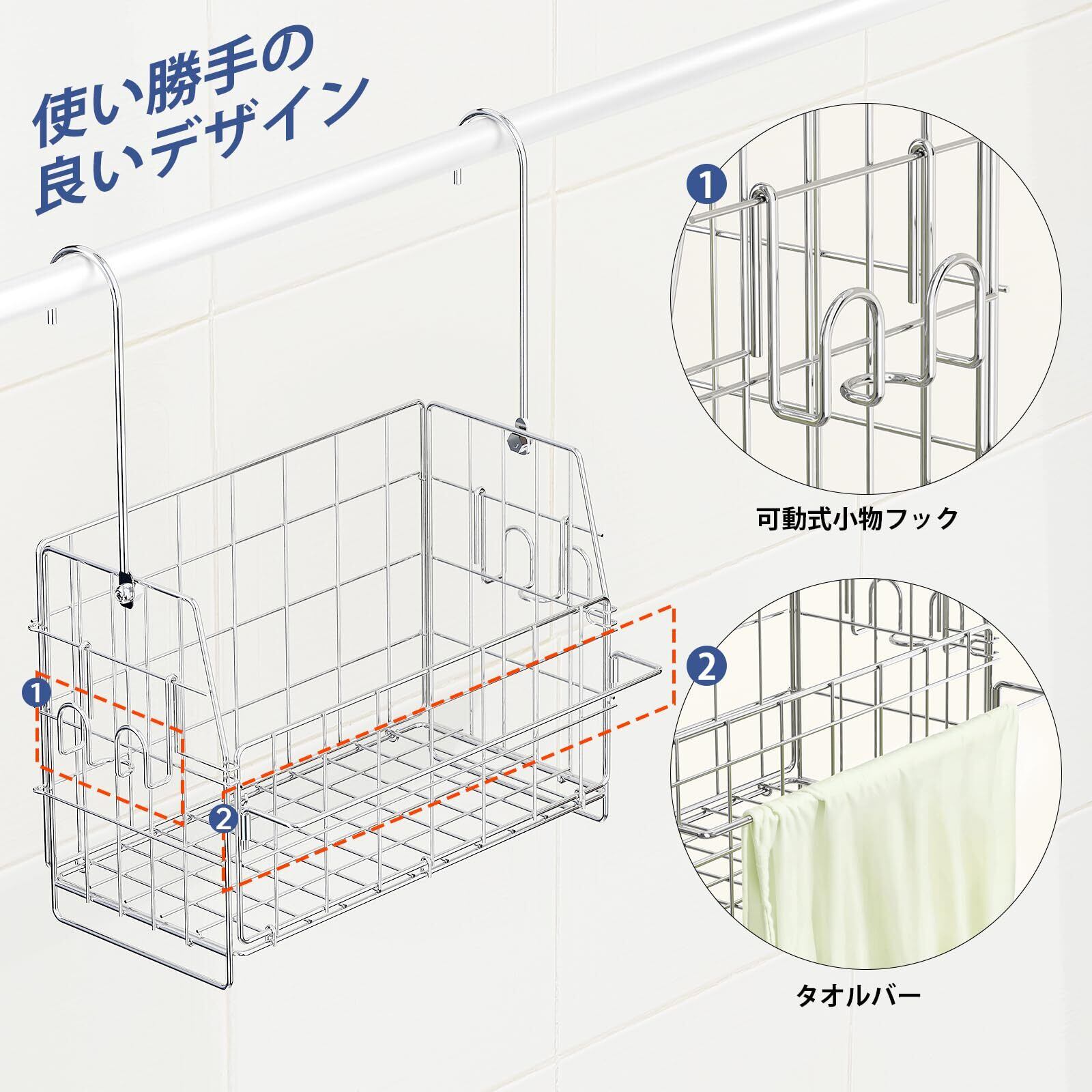 【使いやすいデザイン】組み立てが簡単で、パッケージには組み立て説明書も付いています。浴室用ラックの前端が低く、吊り下げた状態でも中身を取り出しやすい。 バスルームバスケットは深めの設計で、傾けても物が落ちにくい。サイドの小物フックは自由に位置を調整できる、実際の使用状況に合わせてお好みの位置に調節でき、本体のフック部分は長めなので、取り外す際に洗濯竿に引っかかることもありません。また、ネジ部分にはスペーサーが付いているので、長い間使っていても浴室カゴのフックが徐々に緩んでくることはありません。使用しない時はコンパクトに折り畳むことができます。収納スペースを有効活用して省スペース。
