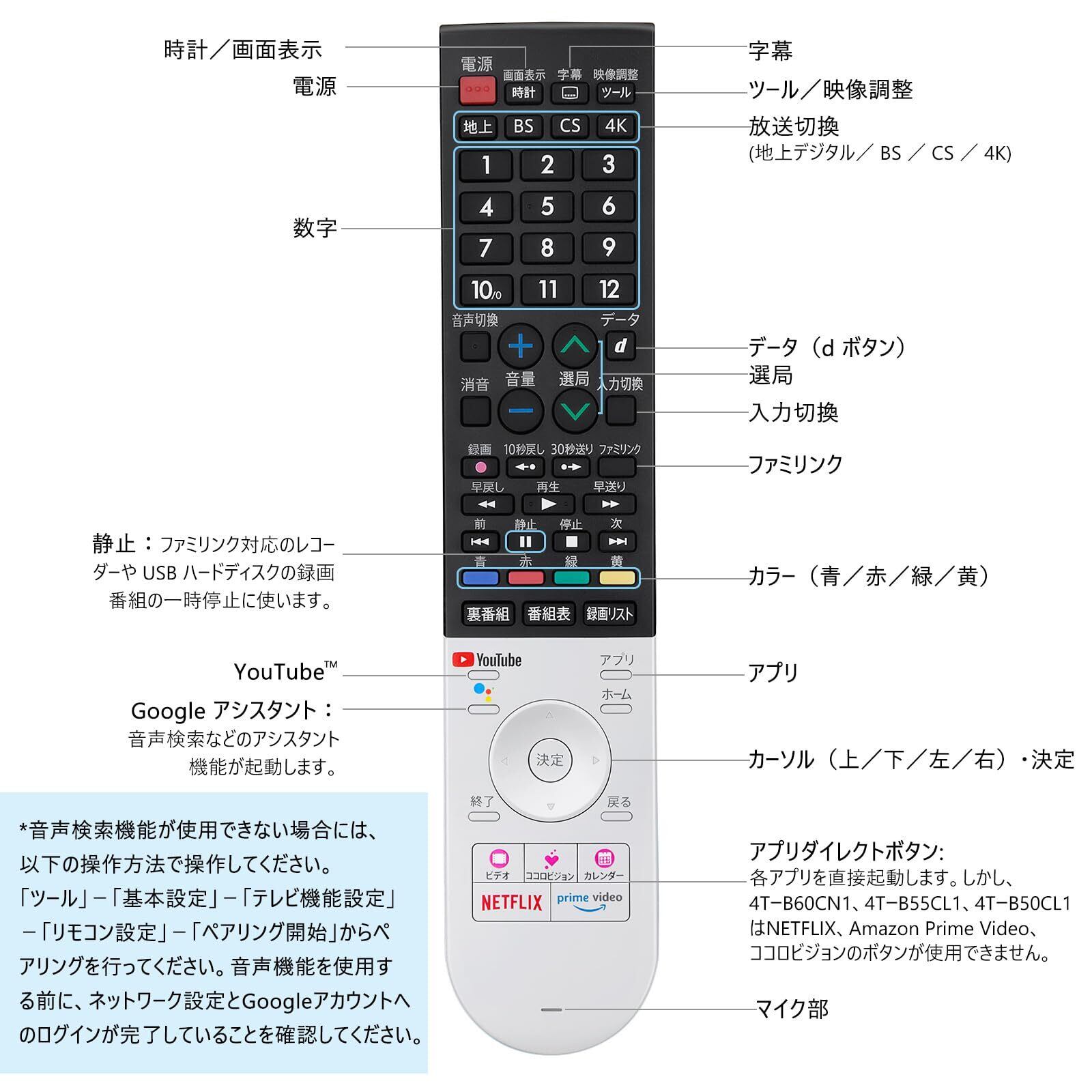 【音声認識機能】音声認識機能が使用できない場合には、以下の操作方法で操作してください。「ツール」-「基本設定」-「テレビ機能設定」-「リモコン設定」-「ペアリング開始」からペアリングを行ってください。音声機能を使用する前に、ネットワーク設定とGoogleアカウントへのログインが完了していることを確認してください。* シャープ アクオス リモコン:単4形乾電池×4本使用(別売)。