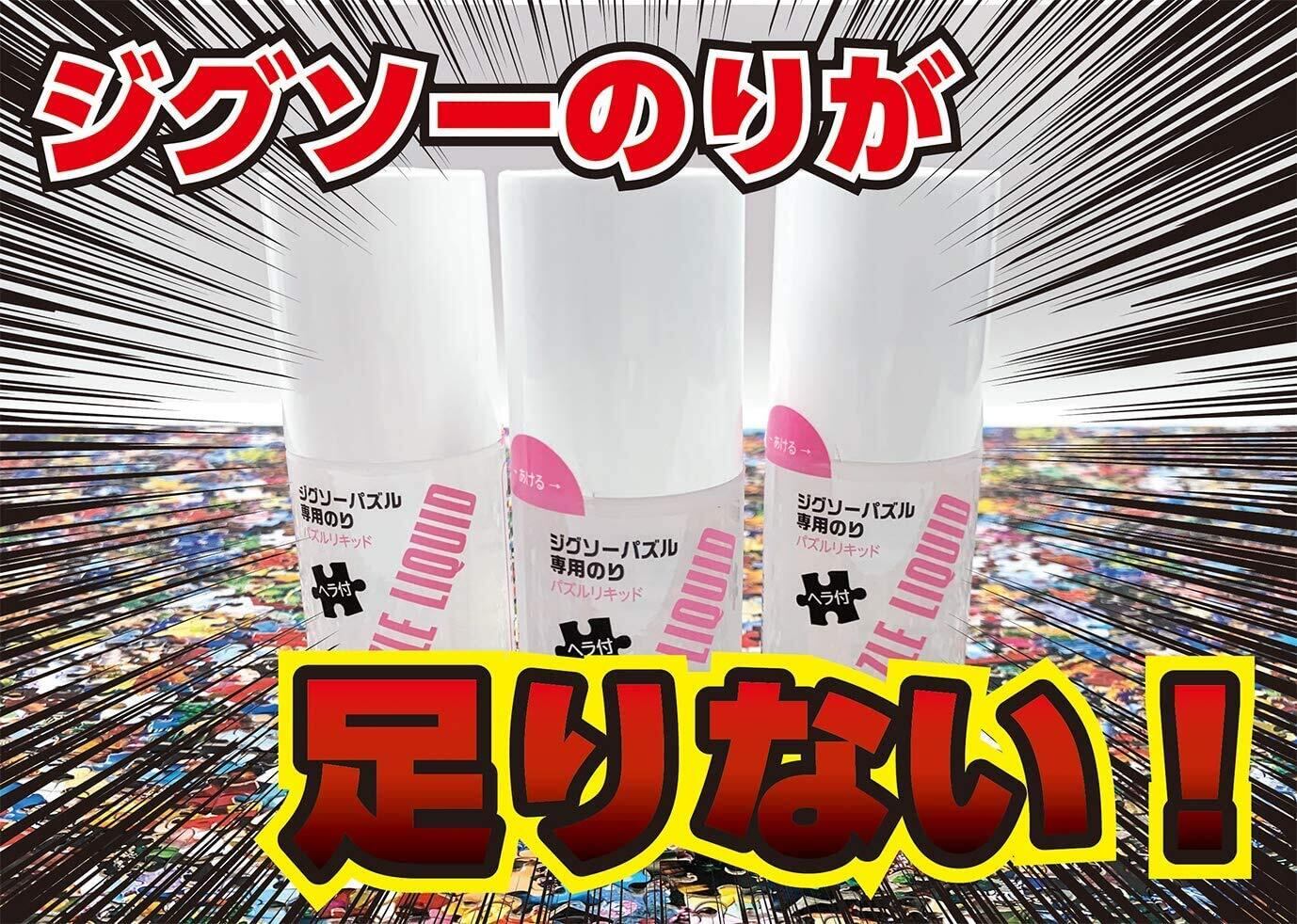 ジグソーパズル専用のりの3本セットです。 組みあがったパズルの表面にのりをおとし、キャップの内側にセットされている専用ヘラでまんべんなくのばしてください。