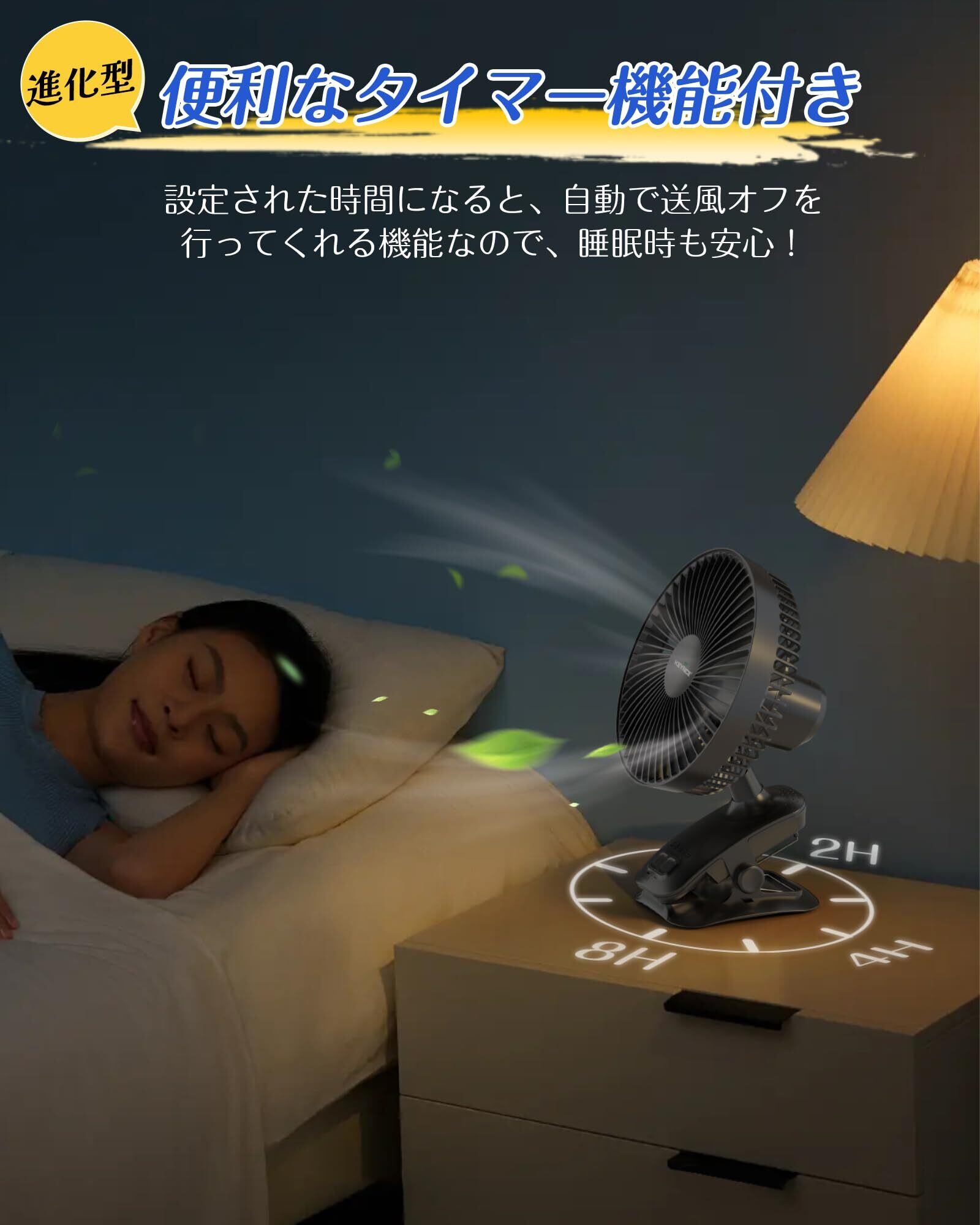 【タイマー付き&自動首振り機能】新登場クリップ扇風機はタイマー設定機能が搭載され、2-4-8時間の3段階で時間設定ができます。睡眠中や仕事中の風の当たり過ぎを防ぎます。そして、左右50°の自動首振り機能を搭載し、手動で左右に360°回転、上向きに35度の調節が可能で、自由にお好みの風向きにすることができます。
