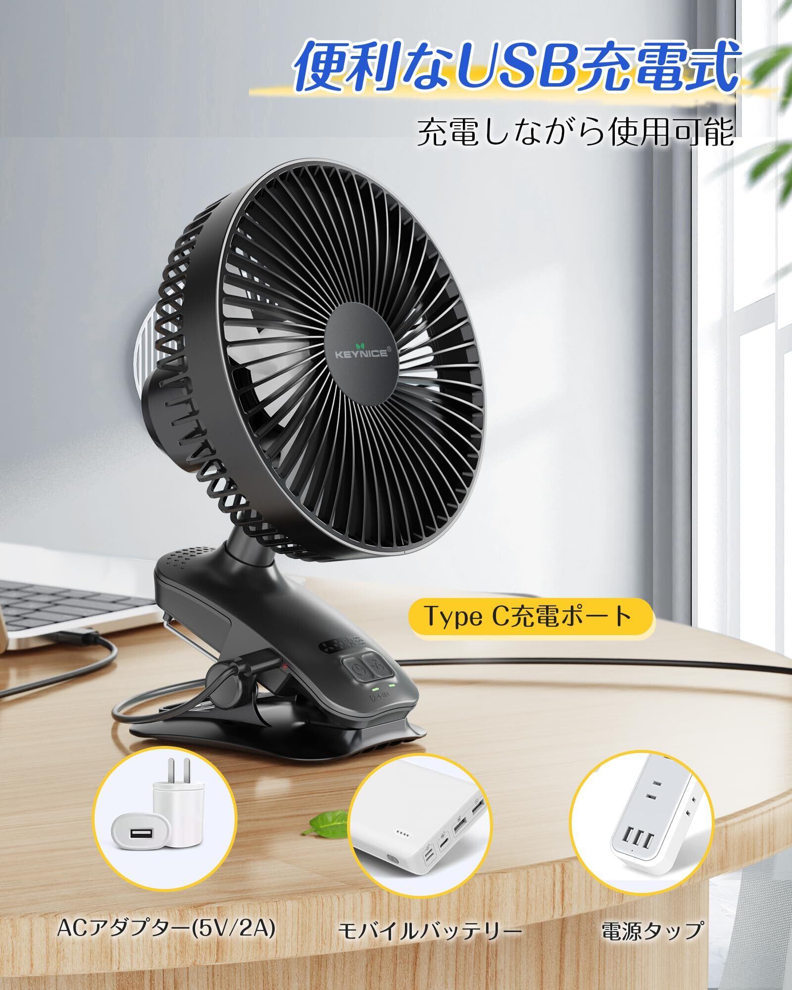 Keynice USB扇風機 自動首振り タイマー機能付 静音 クリップ 卓上 小型 リズム 充電式 節電 壁掛け USBファン 風量4段階調節 長時間連続使用 日本語取扱説明書付 KN-818 (ブラック) | hananoki