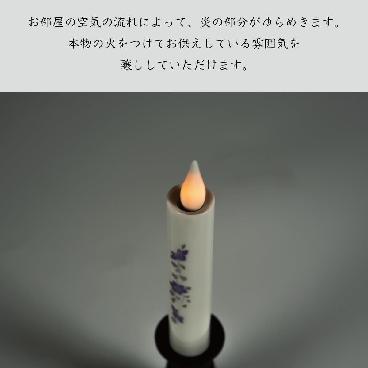 和ろうそくのような外観で、リビングに設置するタイプのステージ仏壇、ミニ仏壇、モダン仏具などのかわいい仏具にも合わせやすい大きさです。この蝋燭は灯を使わず、灯を使わず、煙も出ないため、小さなお子様やペットのいるご家庭でも使いやすい仏壇用品です。
