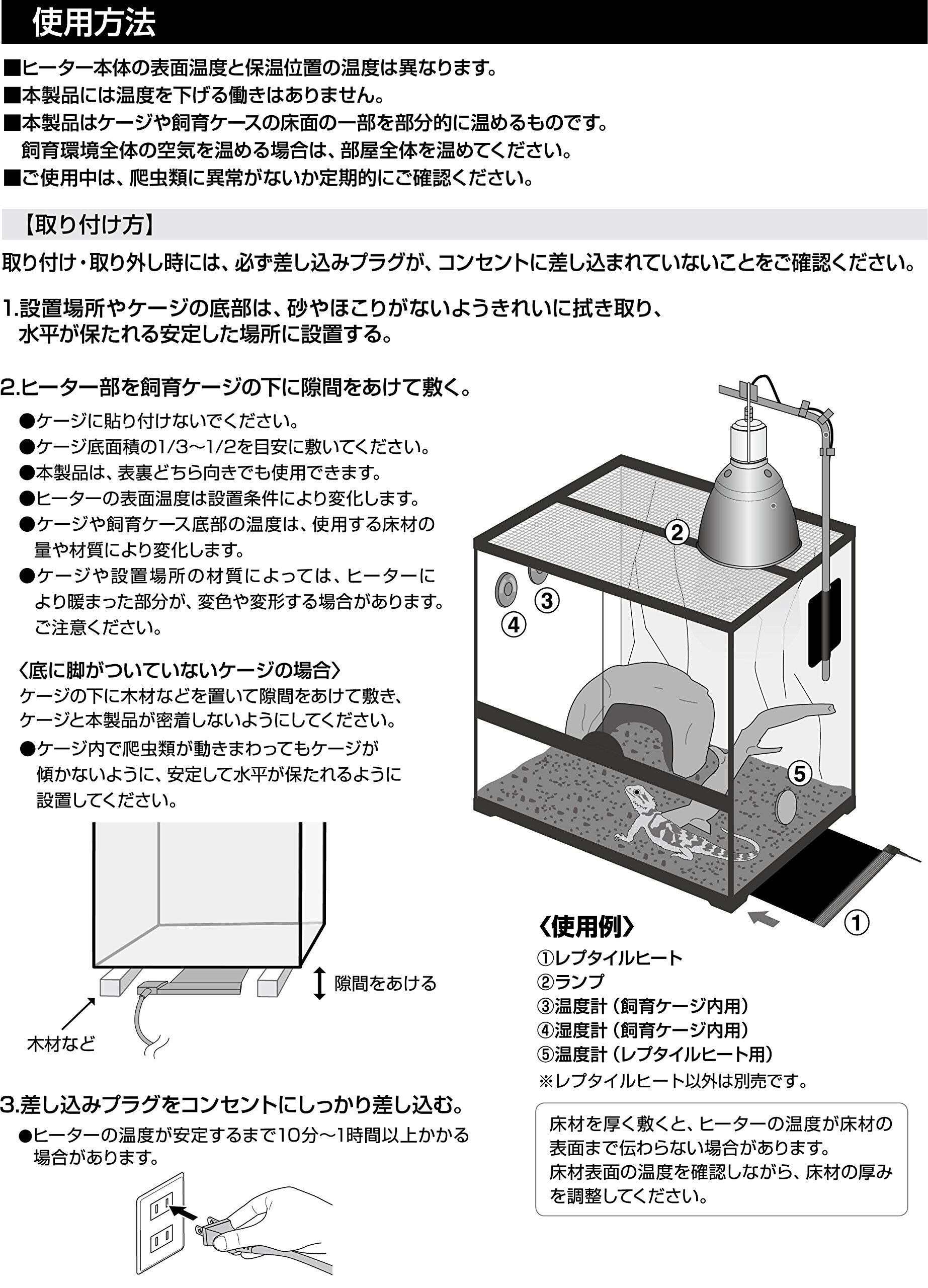 補助ヒーターとして、ケージの下に敷いてご使用ください。ガラスケージの下に敷いて、ケージとレプタイルヒートとの間に隙間をあけてご使用ください。また、ケージの底面積1/3~1/2を目安に設置してください。※ケージに貼り付けて使用しないでください。※ケージの外に設置してください。ケージ内への設置はしないでください。 <使用上の注意> ●本製品には温度を下げる能力はありません。●本製品はケージ内の一部を補助的に保温するヒーターです。ケージ内全体を保温する場合は、部屋全体を暖めてください。●本製品はケージ内では使用できません。必ず、ケージの外に設置してください。●本製品は水中、屋外、多湿な場所では使用できません。●本製品の設定温度はヒーター表面の温度です。飼育環境に応じて設置位置を温度計等で確認し、ご使用ください。●ケージや設置場所の材質によっては、ヒーターにより暖まった部分が、変色や変形する場合があります。ご注意ください。●ケージ内に床材を敷くと、ヒーターの温度が床材の表面まで伝わらない場合があります。床材表面の温度を確認しながら床材の厚みを調整してください。