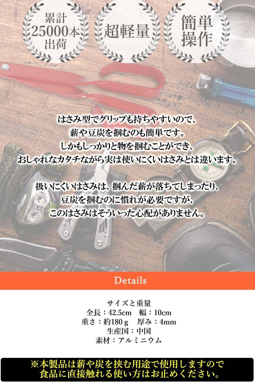 【180gと軽く丈夫な造りの炭ばさみ】 全長:約42.5cm 幅:約10cm 高さ:約1.5cm 厚み:0.4cm 重量:約180g ※簡易な個包装でのお届けとなります ※ロゴは火バサミの目立たない位置に配置しています ※本製品の仕様・デザイン・カラーなどは予告なく変更する場合がございます ※本製品は薪や炭を挟む用途で使用しますので、食品に直接触れる使い方はお止めください ※生産国より大量輸送の為、下側に位置した製品に細かな傷が認められる場合がございますがご了承お願い致します。