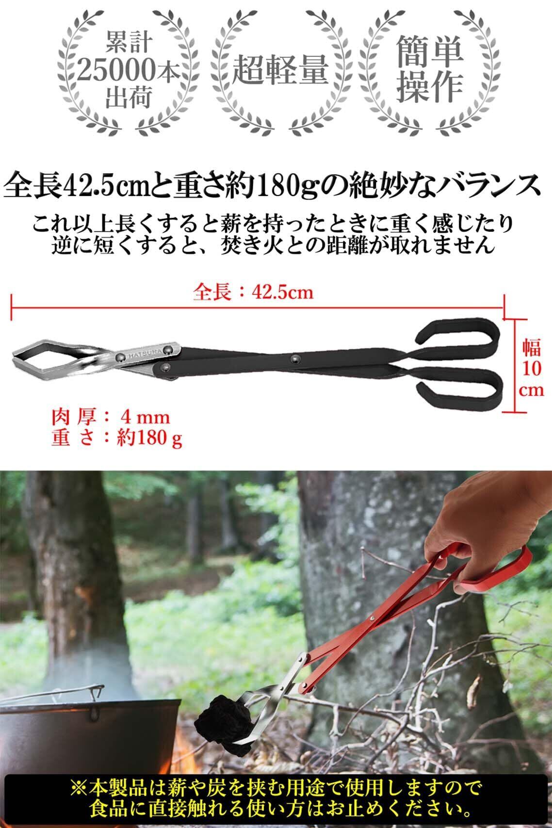 【全長42.5cmと重さ約180gの絶妙なバランスの薪ばさみ】焚き火と距離を保ちながら薪や炭をくべることができます。しかも、この火バサミは180グラムと軽量ですので、はさみを持った時の負担が少ないです。これ以上長くすると薪を持ったときに重く感じたり 、逆に短くすると、焚き火との距離が取れません。