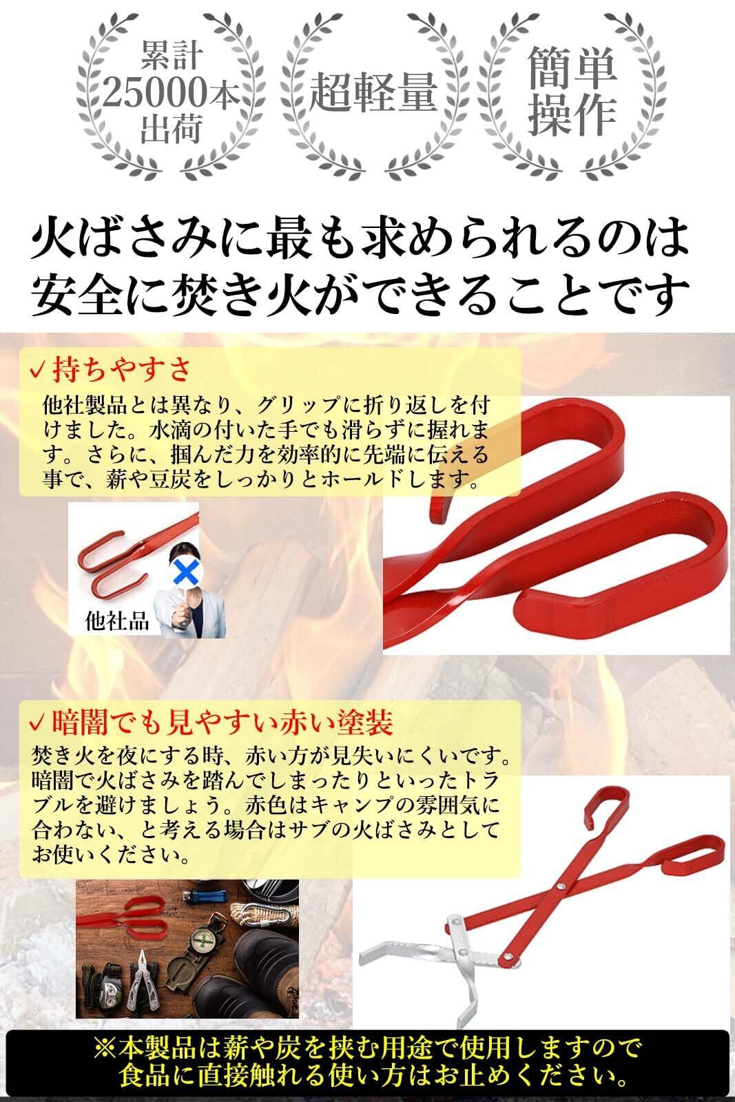 【焚き火をより楽しく過ごせる炭ばさみ】キャンプで人気といえば焚き火です。薪をくべる、豆炭をくべる、これらの用途に最適な火ばさみです。火吹き棒と共に火ばさみはキャンプの必需品です。BBQでは、薪バサミ・炭バサミとしての使い方だけでなく、鉄板や鍋、湯煎した缶詰の移動にも活躍してくれます。キャンプ以外でも、窯への炭入れや、火鉢ハサミとして使えます。※本製品は薪や炭を挟む用途で使用しますので、食品に直接触れる使い方はお止めください。
