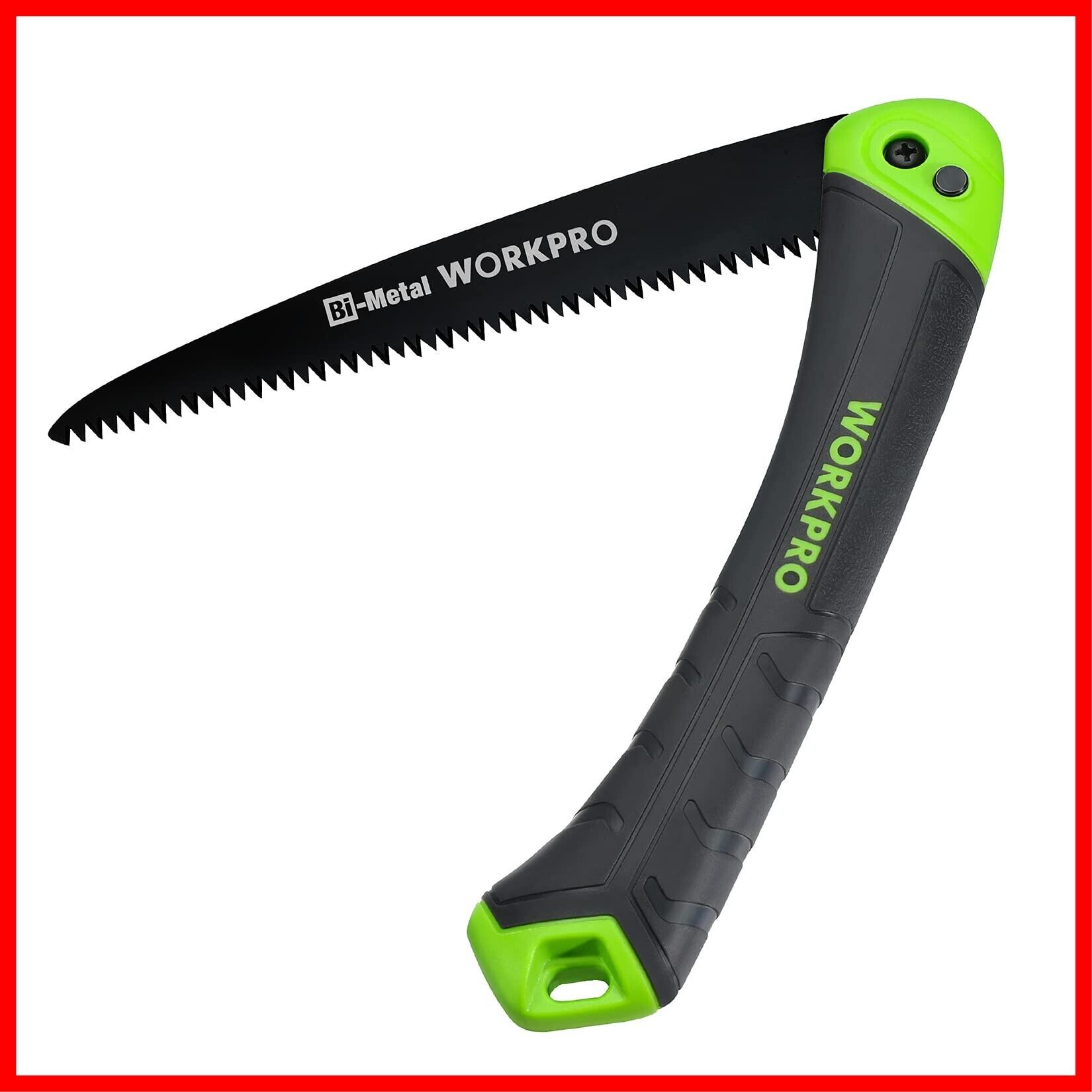 WORKPRO 折込のこぎり ノコギリ 刃渡り180mm 三面歯先 エラストマ樹脂グリップ 安全ロックボタン付き キャンプ 木工 園芸用のこぎり 最大剪定直径:枝切り350mm、生木200mm
