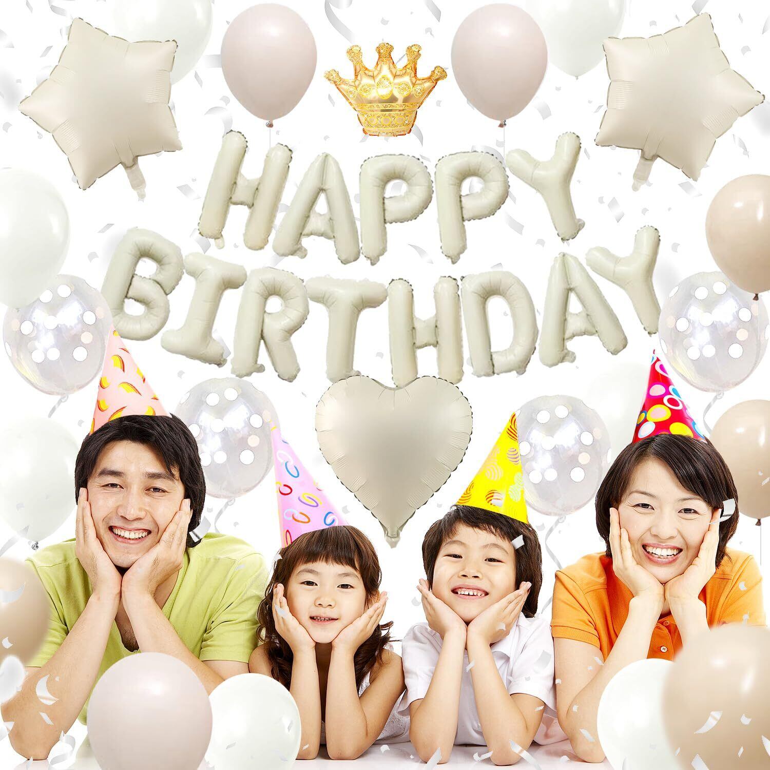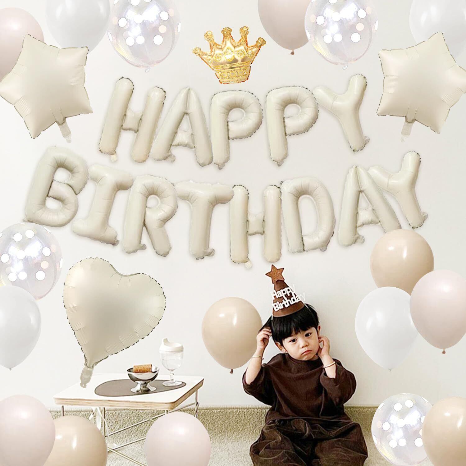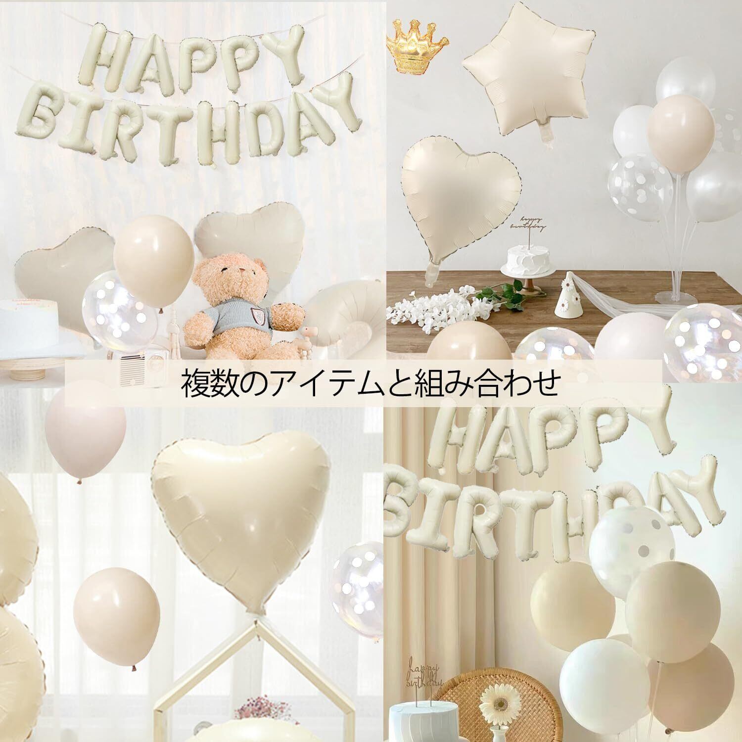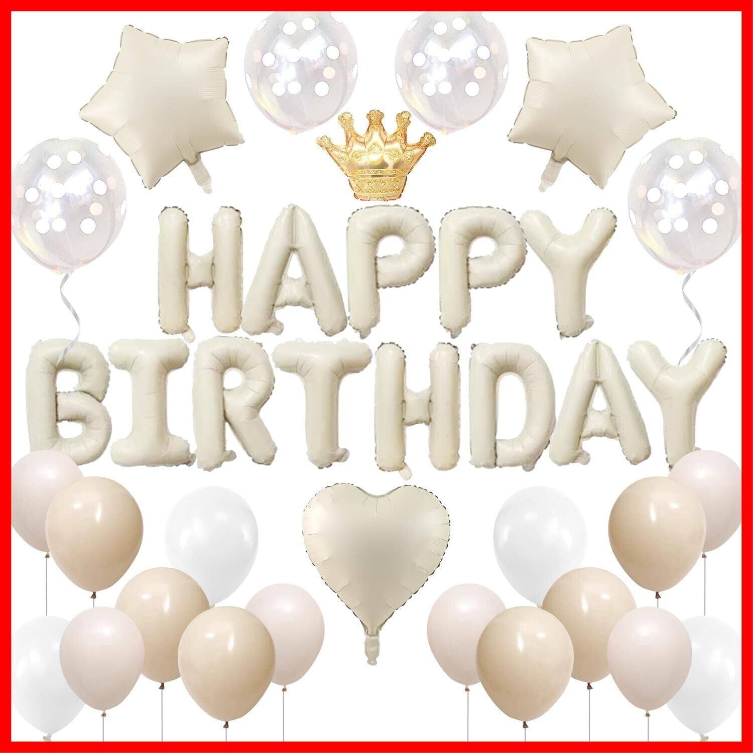【豊富な誕生日飾りセット】①「HAPPY BIRTHDAY」ガーランド×1 ②王冠バルーン×1 ③ハートアルミバルーン×1 ④星形アルミバルーン×2 ⑤グレージュバルーン×6 ⑤ベージュバルーン×6 ⑥ホワイトバルーン×4 ⑥クリアドットバルーン×4 ⑦ドットシール×40個 ⑧リボン×1巻 ※ペタンコの状態でお届けです。