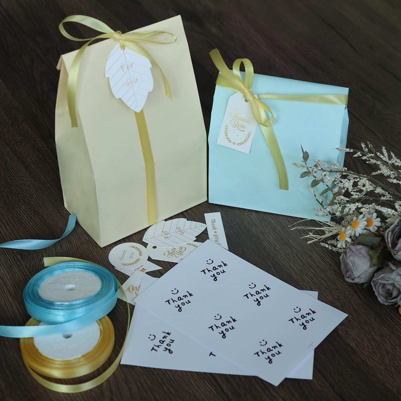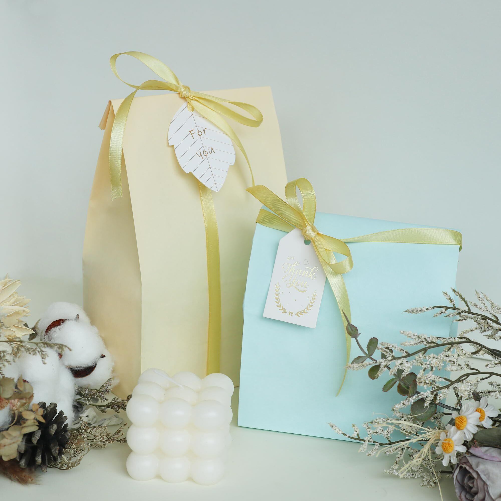 【デザイン】紙袋はマカロン色を使いシンプルな印象を与えながら可愛い雰囲気を出します。タグは感謝の言葉が入って、気持ちを伝えます。また、リボンは高品質のポリエステル素材を使用しており、耐久性に優れており、たくさんの装飾に使えます。