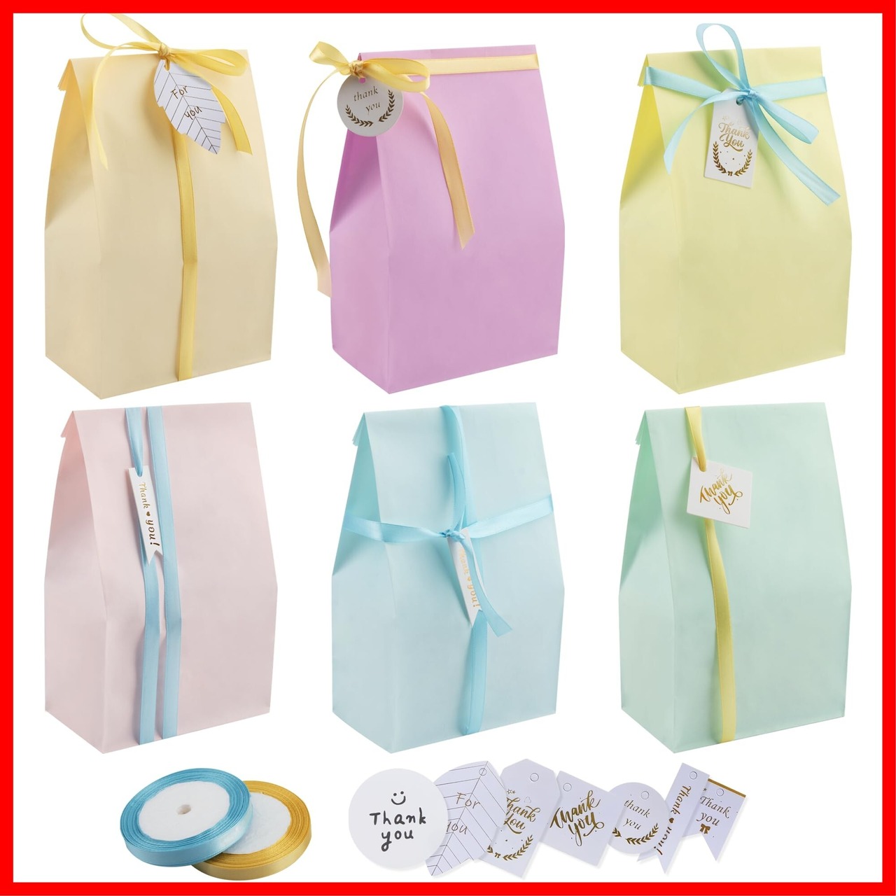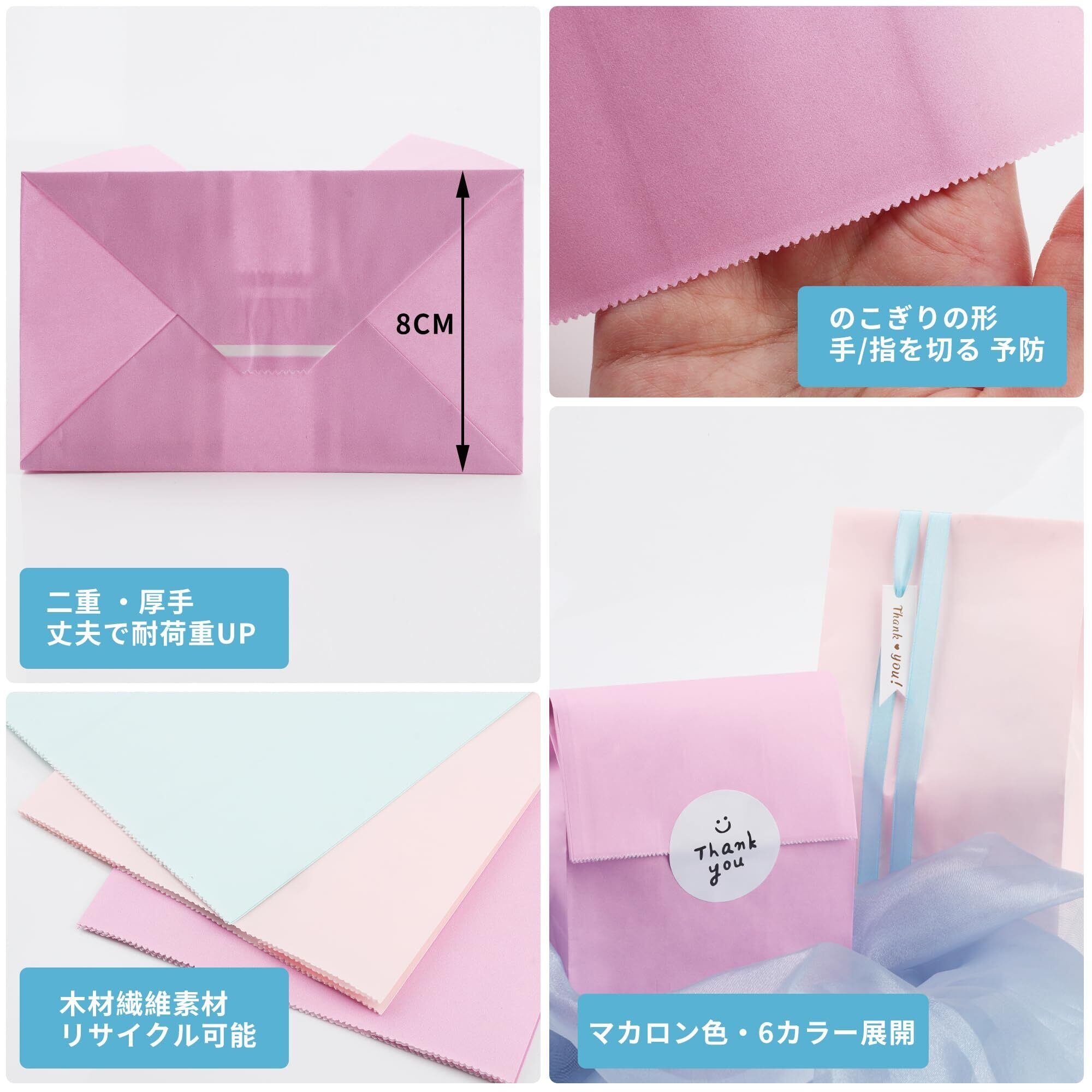 [TEMLUM] ラッピング袋 紙袋 ギフトバッグ 紙バッグ 包む 24枚セット シール付き リボン付き タグ付き 小サイズ 平袋 シンプル おしゃれ 可愛い 包装 リサイクル可能 誕生日 結婚式 収納 (マカロン色) | hananoki