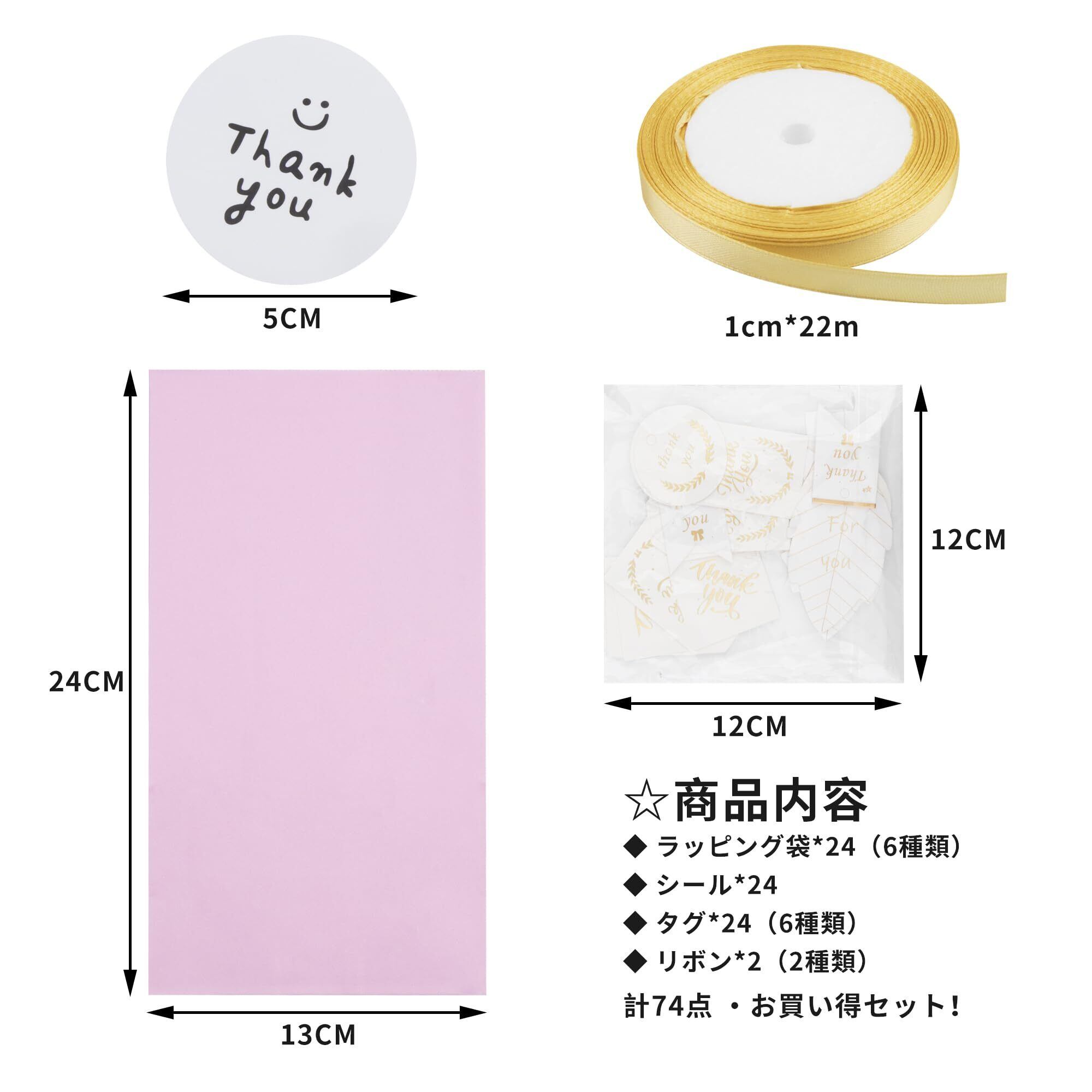 【商品内容】24枚ラッピング袋(6種類):13*24cm 24枚シール:4*4cm 24枚タグ(6種類):3.5cm リボン*2:5m*1mm 合計74点