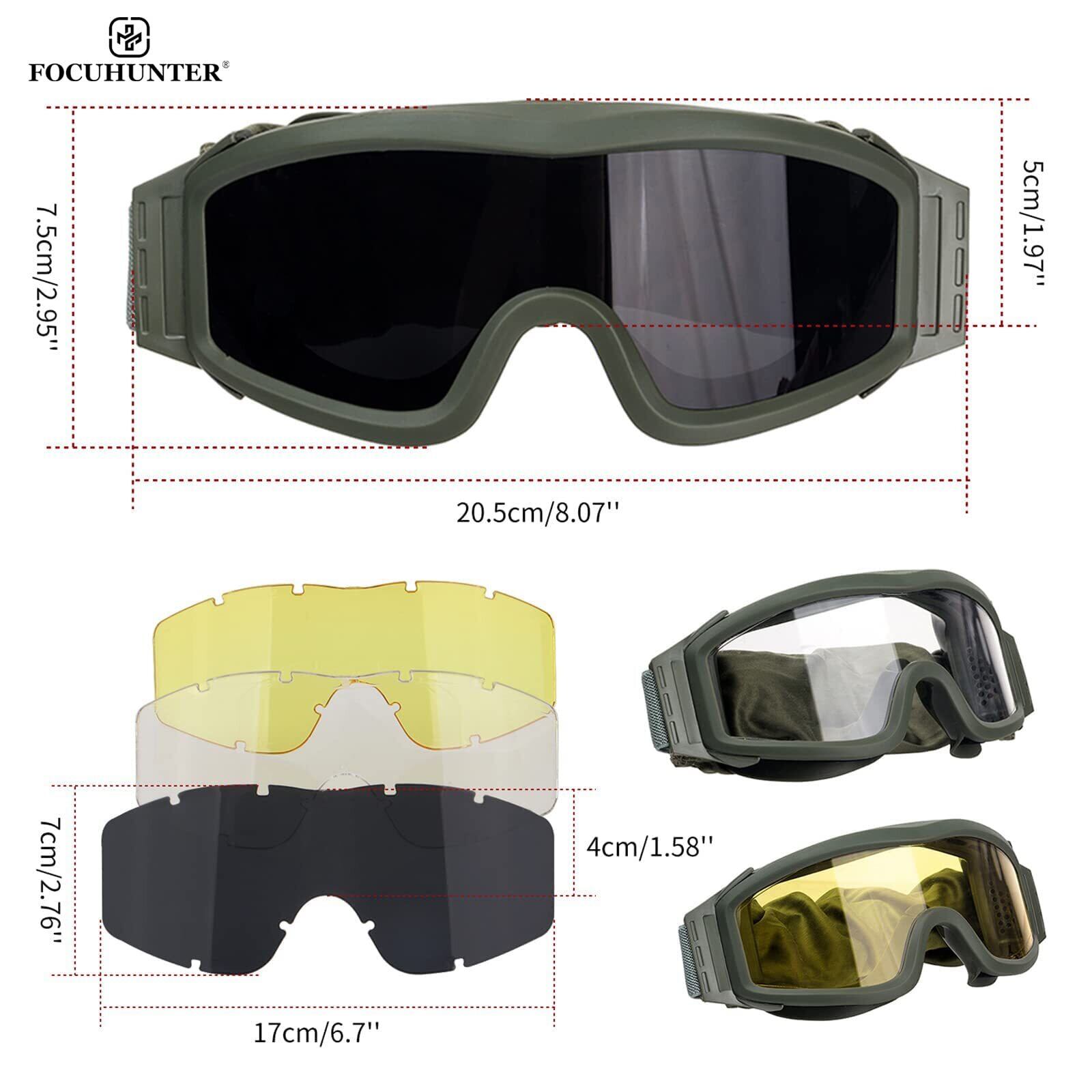 FOCUHUNTER クティカルゴーグル スポーツメガネ 3色レンズセット ゴーグル レンズ交換簡単 長さ調節可能 耐衝撃 通気性 防風 防塵 サバゲー サングラス