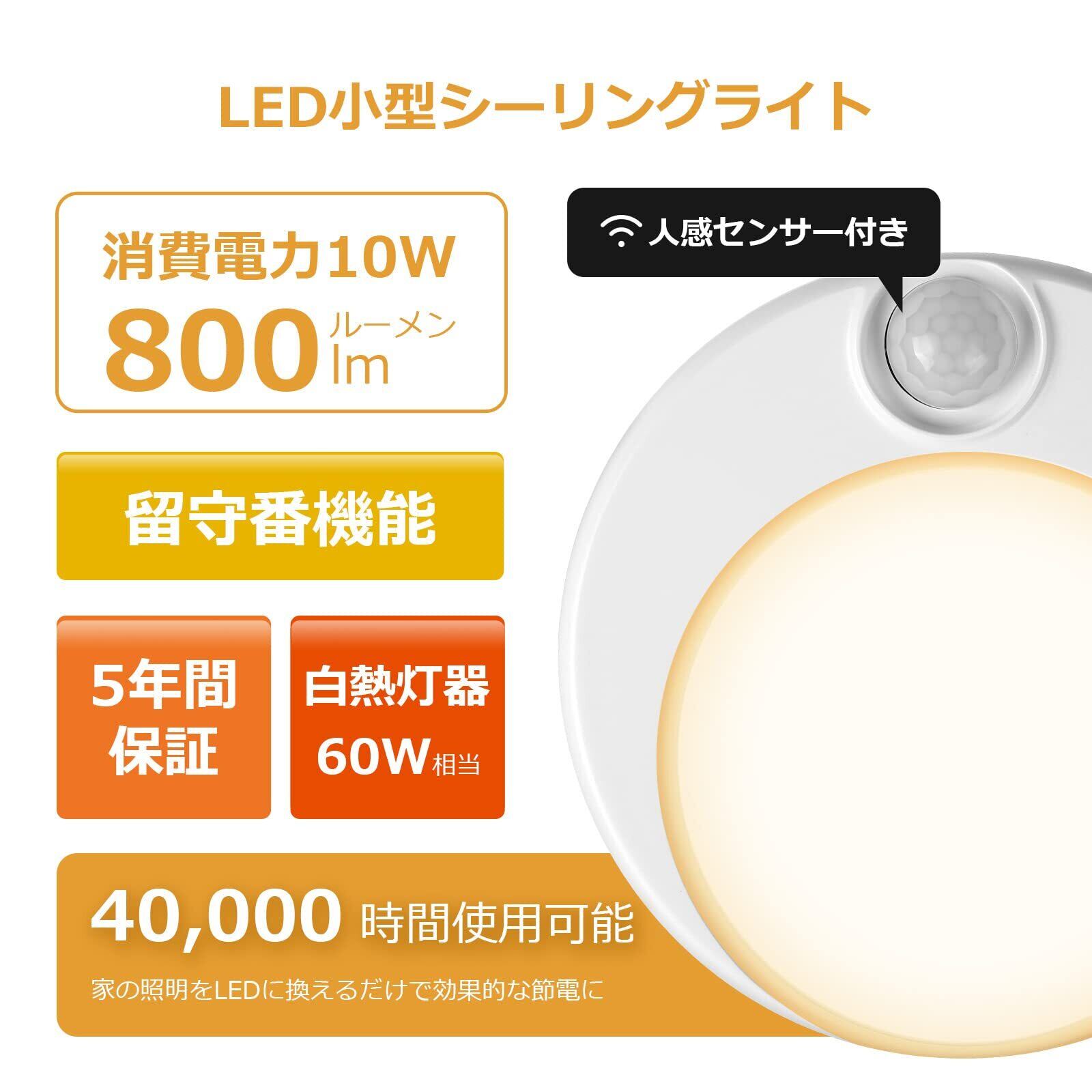 人感 シーリングライト 小型 人感センサー ledシーリングライト 10W 【簡単取付/センサー点灯/留守番機能/800lm高輝度/目に優しい/80Ra高演色性/40000時間寿命/省エネ/PSE認証済み】 玄関 廊下 トイレ 洗面所 脱衣所 ベランダ 天井 和室 洋室 天井照明 室内 コンパクト led照明器具 (3000K電球色)