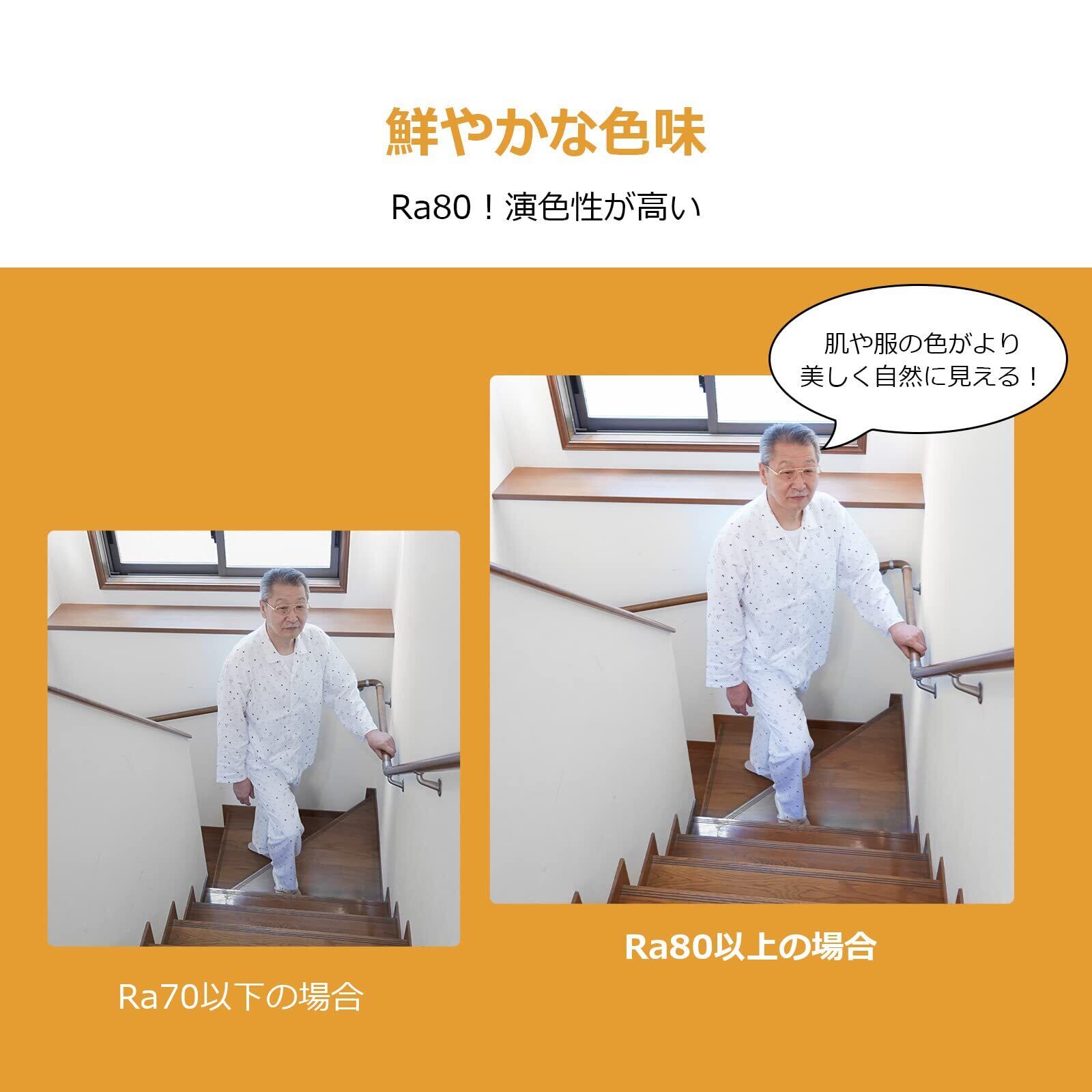 【3000K電球色・高演色性】3000Kの電球色は、暖かみがあり落ち着いた光で、クリアで鮮明な印象を与えます。自然光に近い柔らかな光が均一に広がり、演色性はRa80以上。物本来の色をより美しく自然に再現します。800ルーメンの明るさで、ちらつきも一切なく、長時間の使用でも快適です。