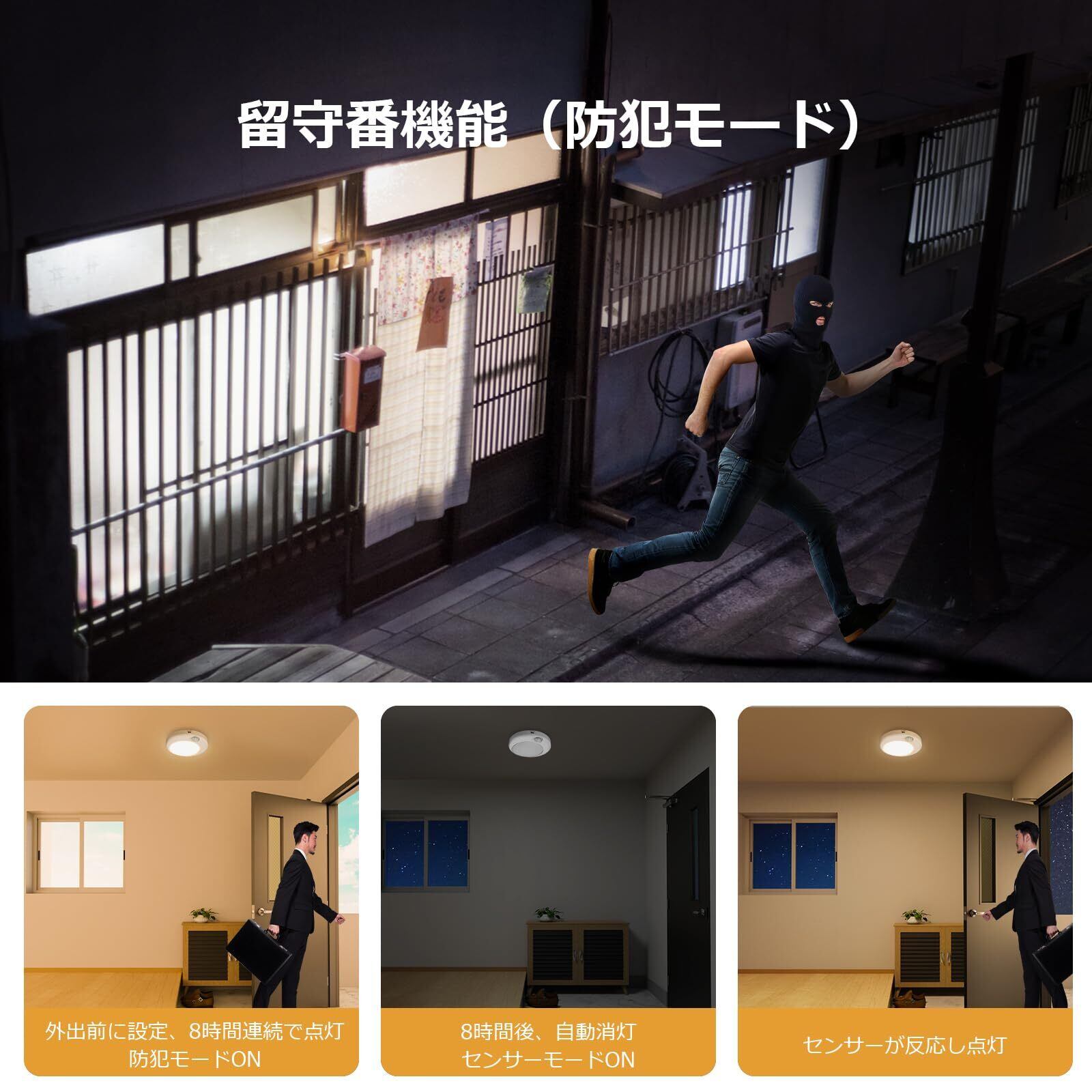 【留守時に在宅を装う防犯モード】「1」モードでは、壁スイッチのON/OFFを繰り返すことで防犯モードが作動します。外出前に設定しておけば、ライトは8時間連続で点灯した後、自動的に消灯します。その後、人の帰宅を感知すると再び点灯します。留守番機能により、留守中でも在宅しているように見せかけることができ、防犯面でも安心です。