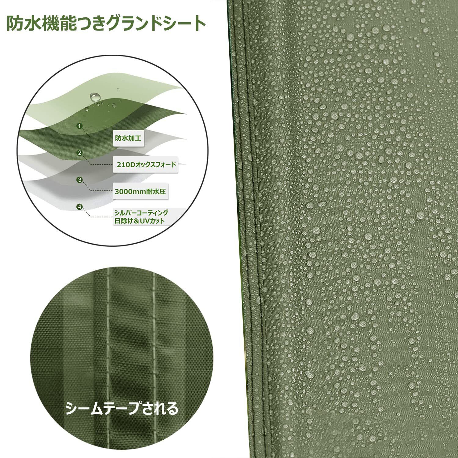 【厚手の210D生地】テントシートは210Dポリエステルオックス素材を採用し、強度不足の心配必要がない、薄い素材のシートより耐久性があります。優れた耐摩耗性があり、長年の使用でも摩耗しにくく、耐久性も優れます。防水性と耐久性を兼ね備えたテントシートです。