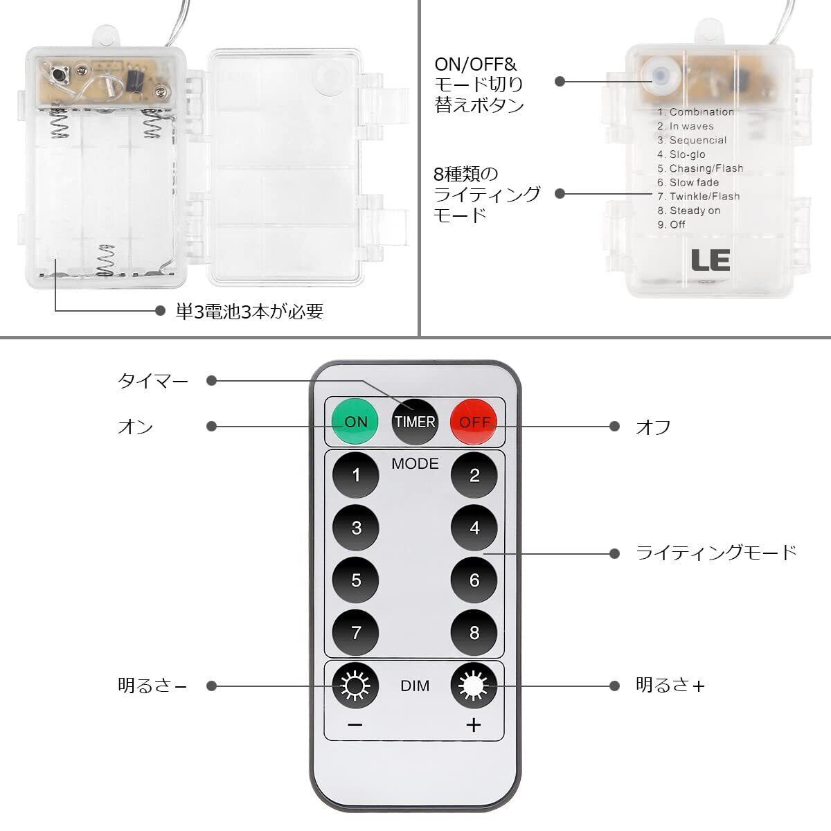 【8種点灯モード&タイマー機能】付属のリモコンで8つの調光モード(連続変更、波状変更、点滅、ちらつき効果、早い点滅、遅い点滅、ドリーム変更、常点灯)を自由に切り替えます。また、リモコン上のTIMERボタンを押すと、1日には6時間明かりを照らして18時間消えるサイクルに設定します。