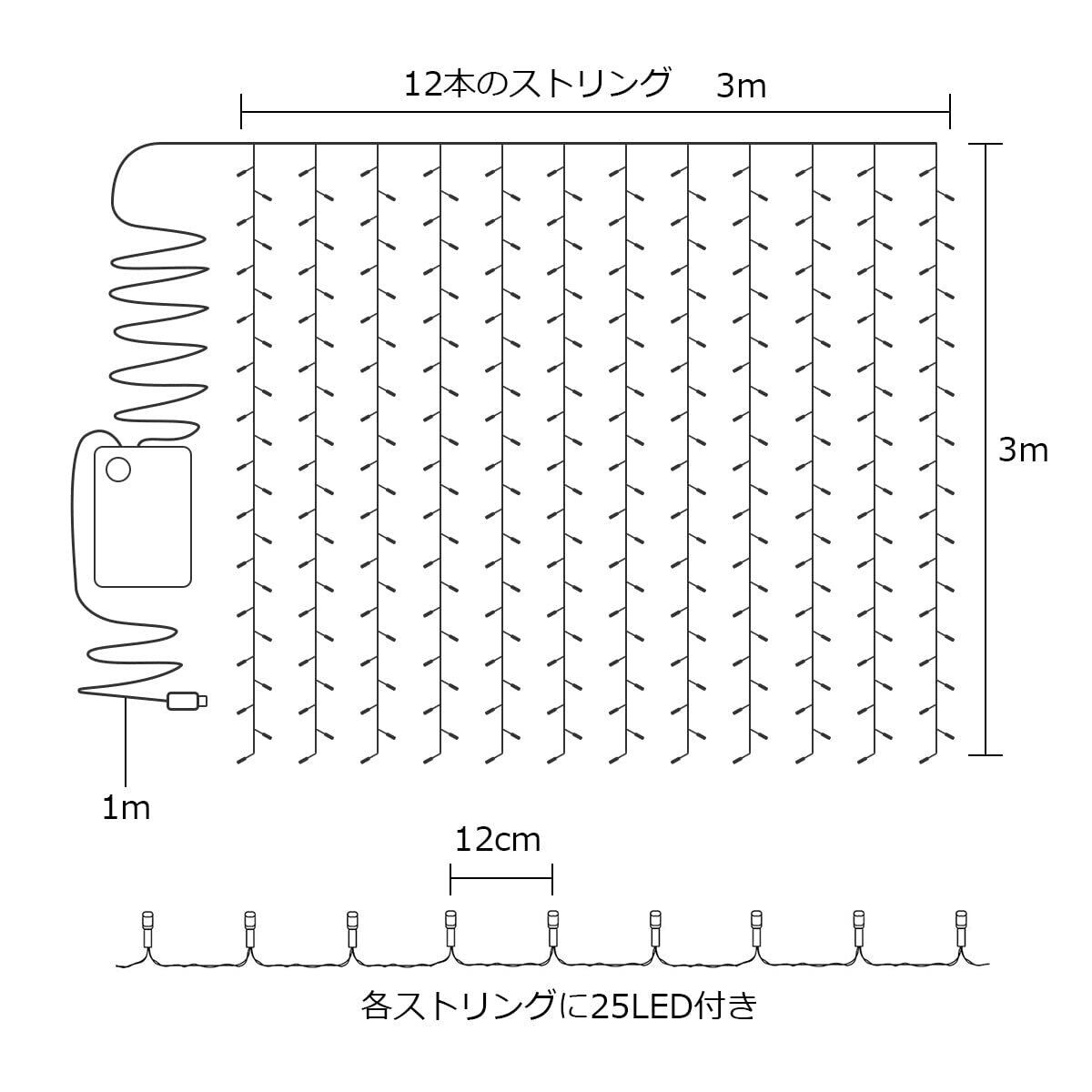 【防雨型イルミネーションライト・屋内屋外兼用】省エネタイプのLEDライトが300球搭載され、従来電球タイプに比べ電気代約1/10!IP44防水仕様なので、屋内での飾りはもちろん、屋外でも雨や雪の日にも安心でご利用いただけるようになります。展開後のサイズは3M×3M で、カーテンの上に重ねるようにつけると、幻想的な雰囲気になります。
