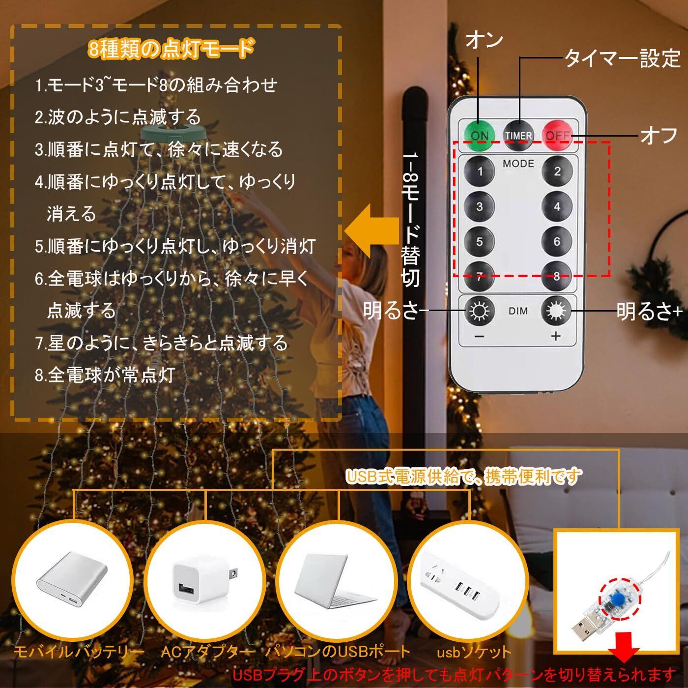クリスマスツリー イルミネーションライト ストリングライト クリスマスツリー飾りライト 2M 8本 280球 8パターン USB式 メモリー機能 防水 高輝度 LED電飾 クリスマス ドレープライト フェアリーライト クリスマスツリー飾りライト 電飾 防水 クリスマスつりー専用 xmas christmas tree decoration | hananoki