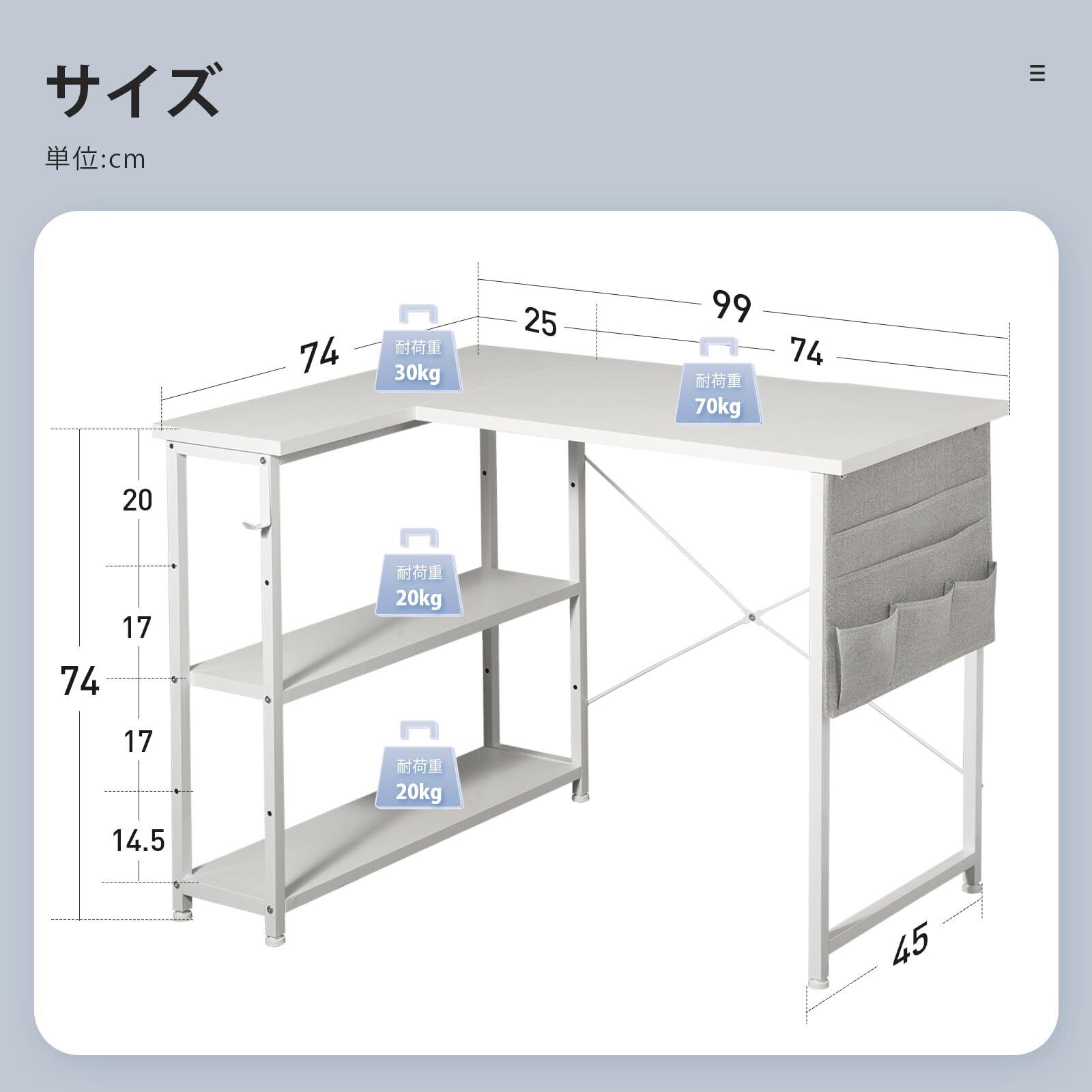 Maihail l字デスク 机 pcデスク 学習机 勉強机 パソコンデスク 右棚左棚 幅99cm コーナーデスク つくえ 棚板高さ調節可能 作業机 L字型 リモートワーク ラック付き 白い | hananoki