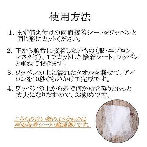 使用方法:備え付きの両面接着シート(繊維糊)をアップリケと同じ形にカットして、貼り付ける場所に接着シートにアップリケを置く、濡れタオルで当て布をしてアイロンを10秒ぐらいかけると完成です。