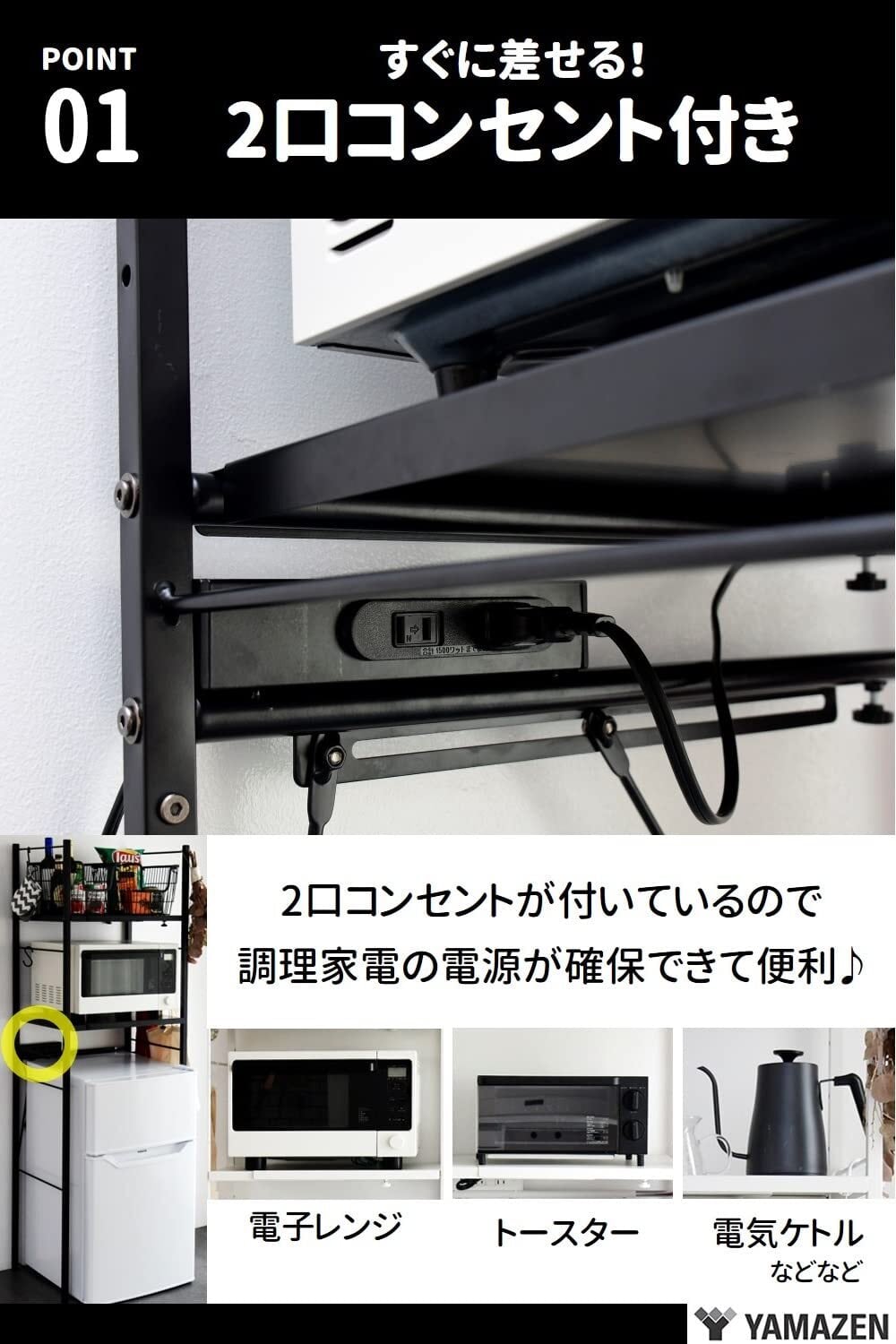 ●コンセント付きなので、レンジやトースターなどの電源を確保できる