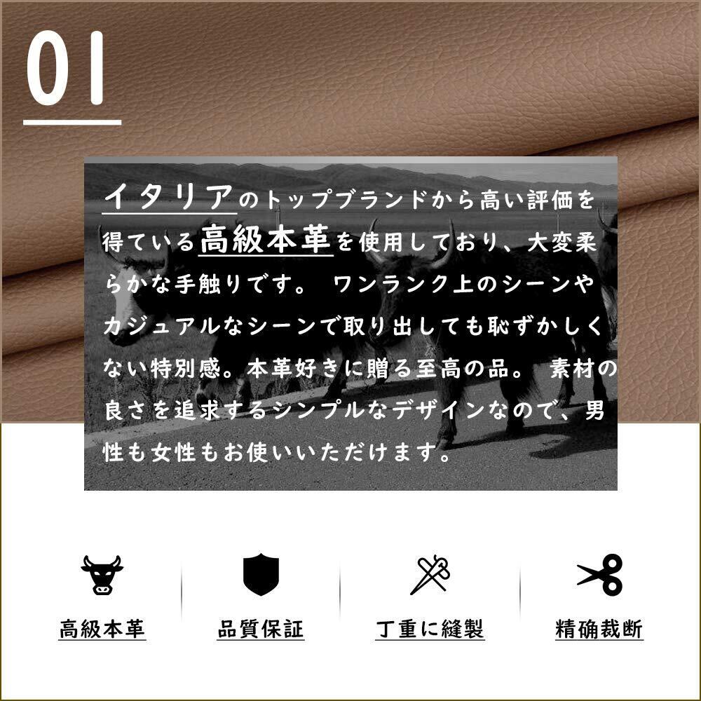 【高級牛本革】イタリアのトップブランドから高い評価を得ている高級牛本革を使用しており、大変柔らかな手触りで、見た目もすごく高級感があります。天然皮革(牛革)の特徴として、動物が生きた環境、食べ物、年齢などにより、皮の厚さ・硬さ・質感・シワ・傷・ホクロ・スジ・凹みなどが異なり同じものはふたつとありません。これが、さらに染色などの加工が施され更なる1枚1枚の味わいを醸し出します。経年変化(エイジング)は、自分だけの風合いがでることが革製品の醍醐味。使い込むごとに世界に1つだけのアイテムに変化するオンリーワンアイテム。「天然皮革(牛革)のいい本格レザー」は、鼻を近づければ革の香り、しっかりとした感じ、持つたびに手に馴染む使う楽しみ!本革好きに贈る至高の品。