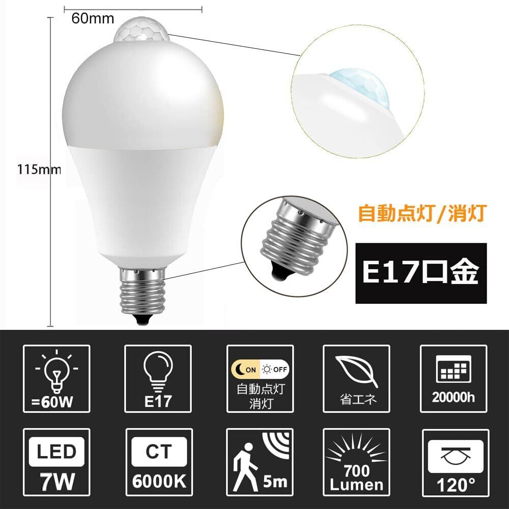 LED電球 E17 人感センサー 電球色 60W形相当 7W 700lm 明暗センサー付き 消し忘れ防止 自動点灯 高輝度 AC100V 非調光 省エネ PSE認証済み 2個入 (昼光色 6000K) | hananoki